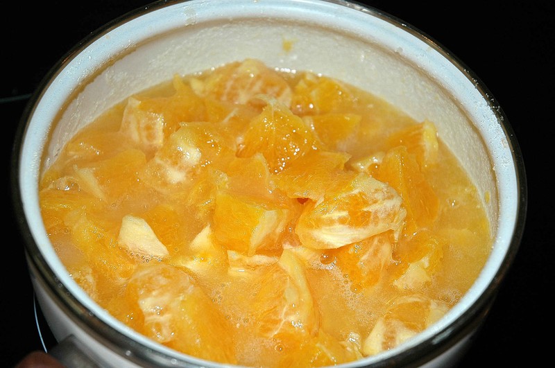 Les rincer à l’eau froide, laver la casserole et répéter l’opération 2 fois. Détailler la chair des oranges en petits dés, les déposer dans une casserole, ajouter les écorces égouttées et le sucre. Cuire à feu doux 1h30. Ajouter un peu d’eau si nécessaire. Verser le jus de citron, mélanger et réserver au frais.