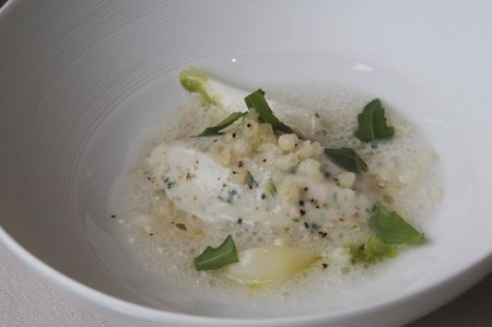 Encore une fois que du bonheur… de la finesse, des saveurs marines tout en restant sur terre! Le bouillon mousseux est une écume d’huile d’olive, on note le rappel amusant de la pomme de terre sous forme de chips rustiques ou le petit morceau de feuille de laitue en parallèle avec la crème pommes de terre/laitue.