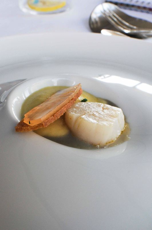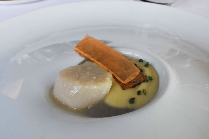 Une noix de Saint-Jacques juste poêlée, un jus iodé, un croustillant de pomme et une gelée piment d’Espelette: une juxtaposition de textures et de saveurs, c’est très fin et très apprécié.