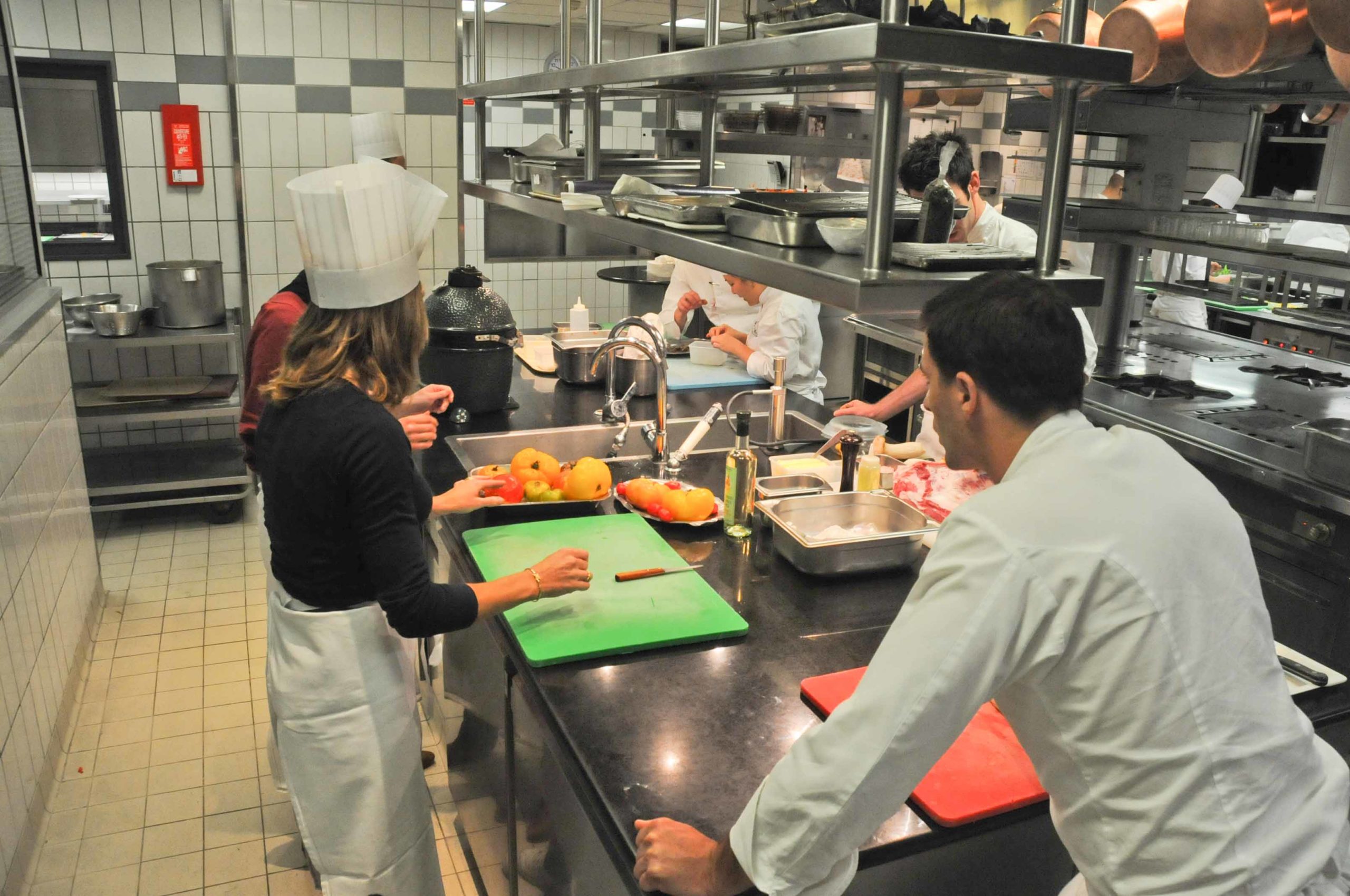Et sans plus attendre, on commence avec Marine à préparer les différentes variétés de tomates qui seront utilisées pour l’entrée, aux cotés de Christopher et de son second Benoit Schmitt, tous les 2 pédagogues et patients 😉