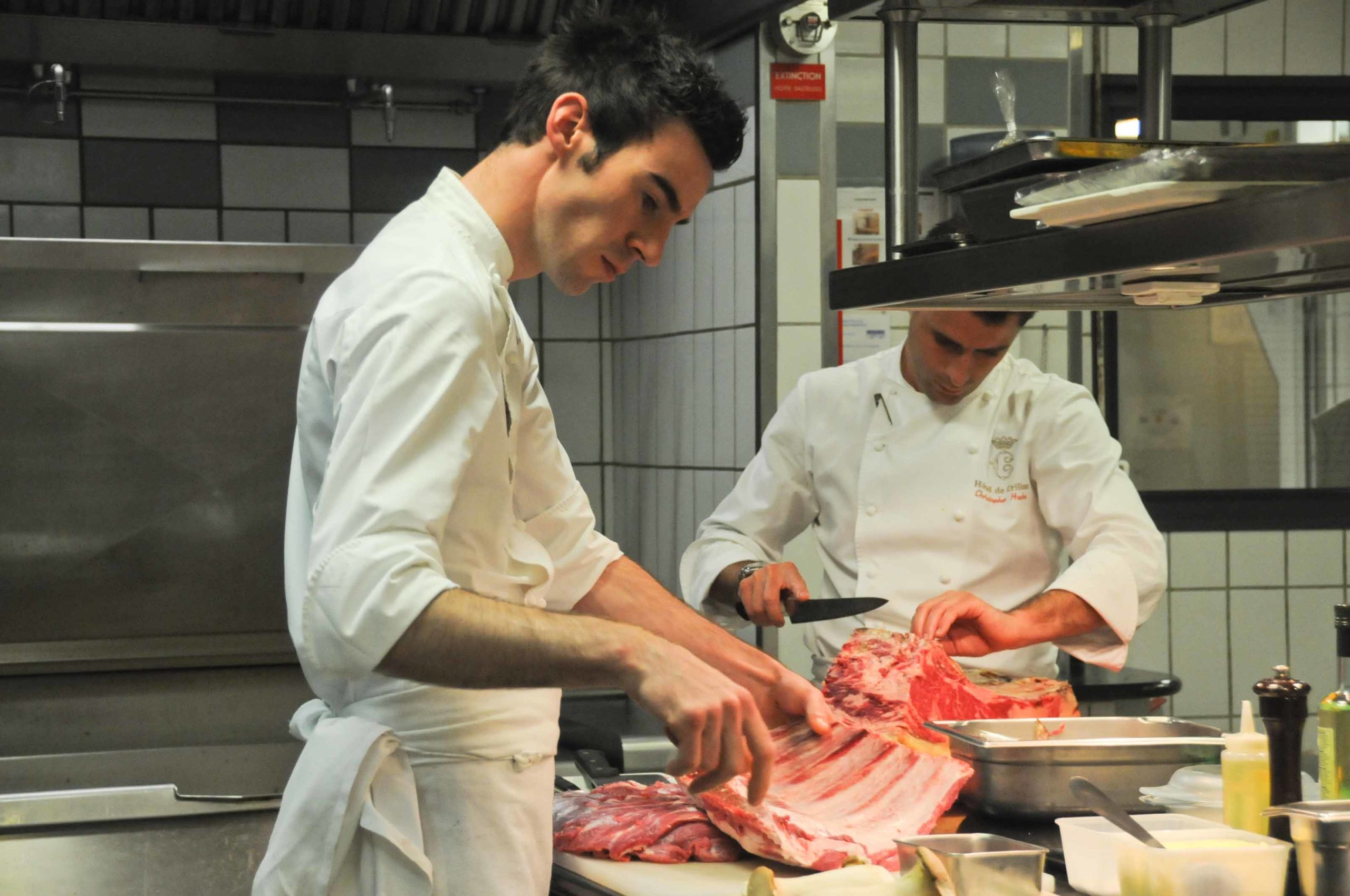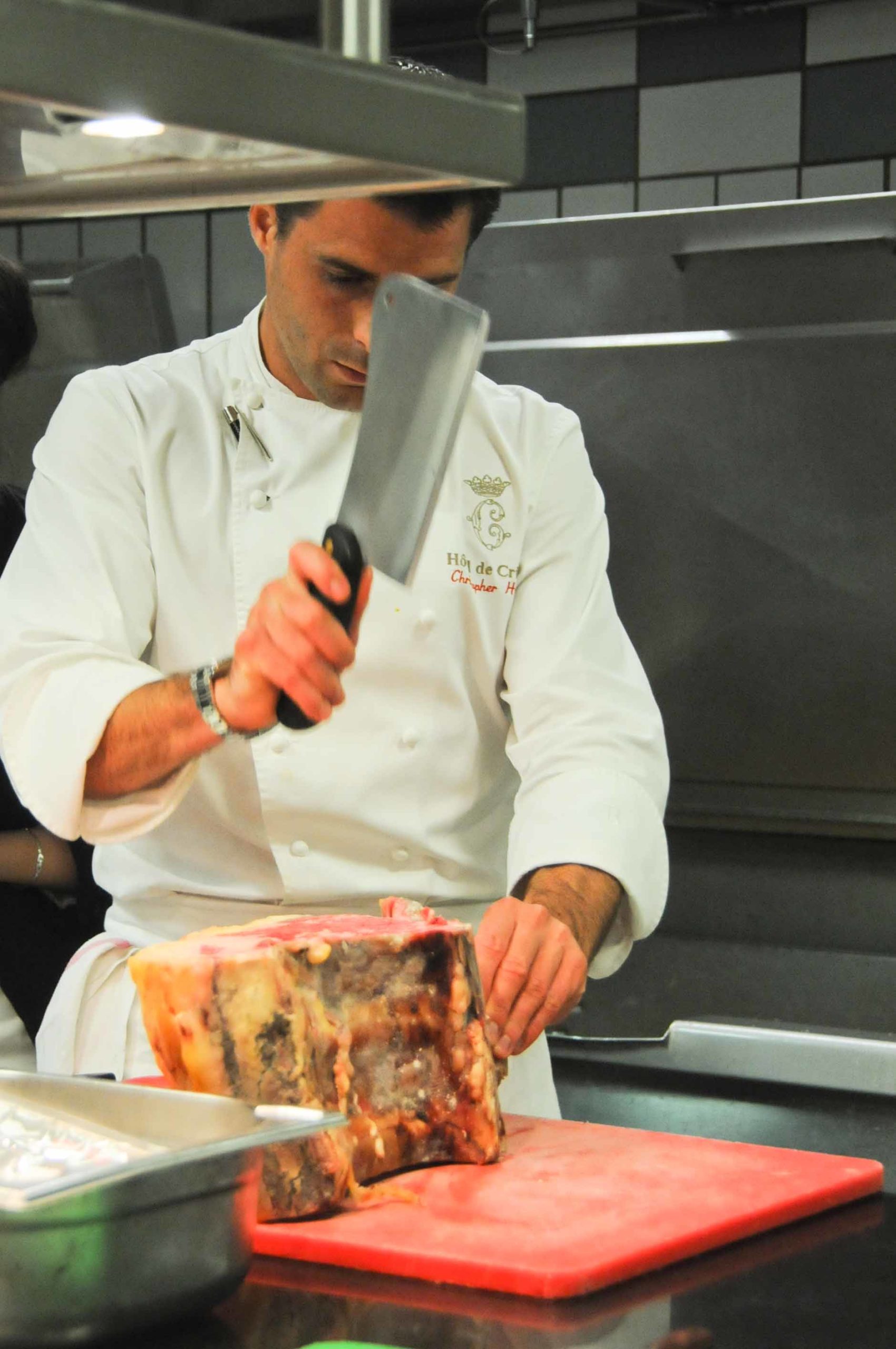 Christopher s’est attaqué à la « bête »: il pare, coupe le morceau de boeuf de Galice avec professionnalisme: