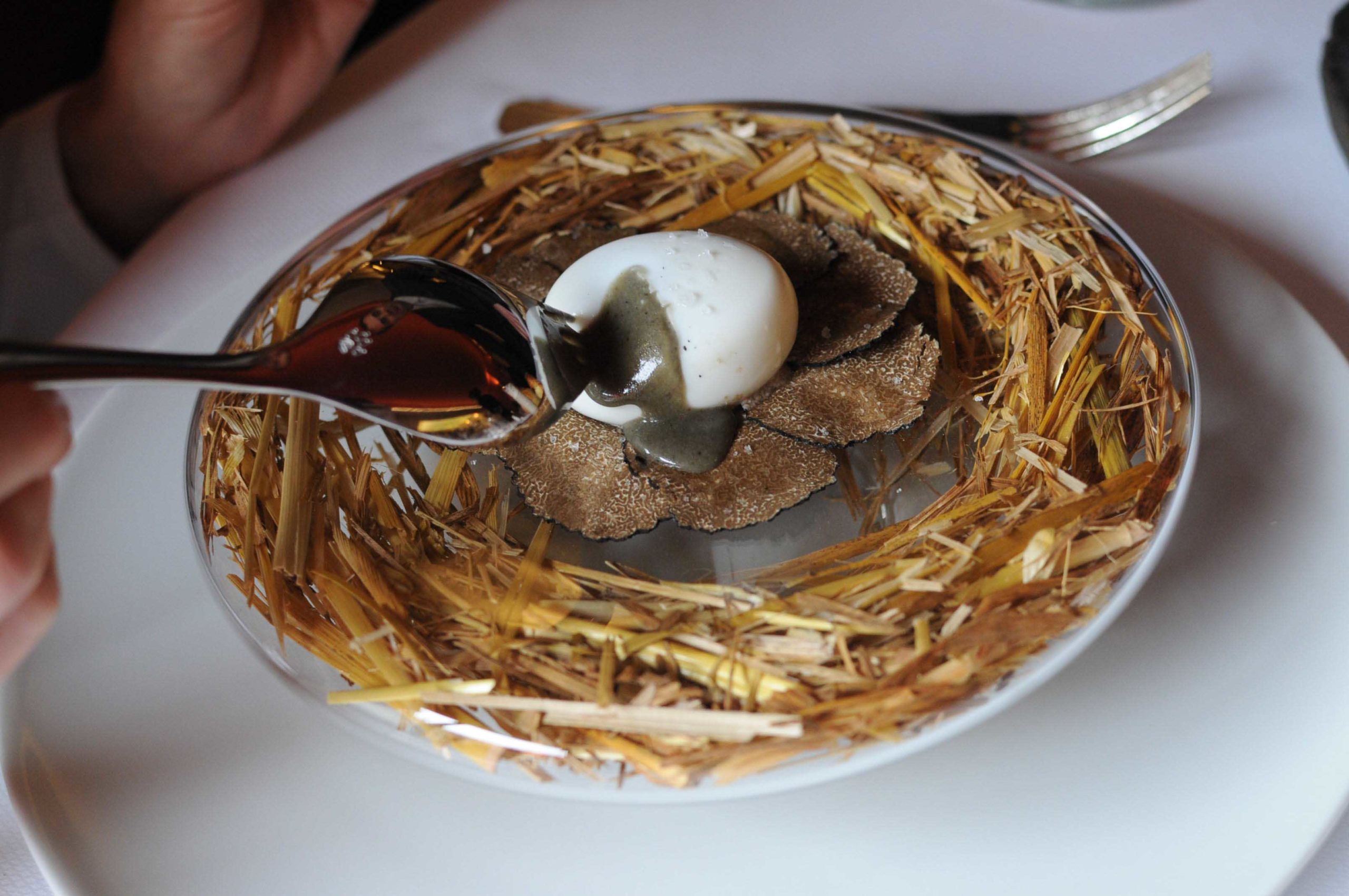 Quand on parle de Gilles Goujon, on associe souvent son plat phare « l’oeuf pourri »… un nom peu flatteur pour un plat de restaurant… et pourtant ! Cet oeuf  emblématique est en fait »pourri » de truffes sous différentes textures et consistances: lamelles de truffes et purée de truffes dessous, oeuf garni d’un sabayon de truffe coulant dès que l’on entaille le blanc d’oeuf et sabayon de truffe again ajouté au moment!