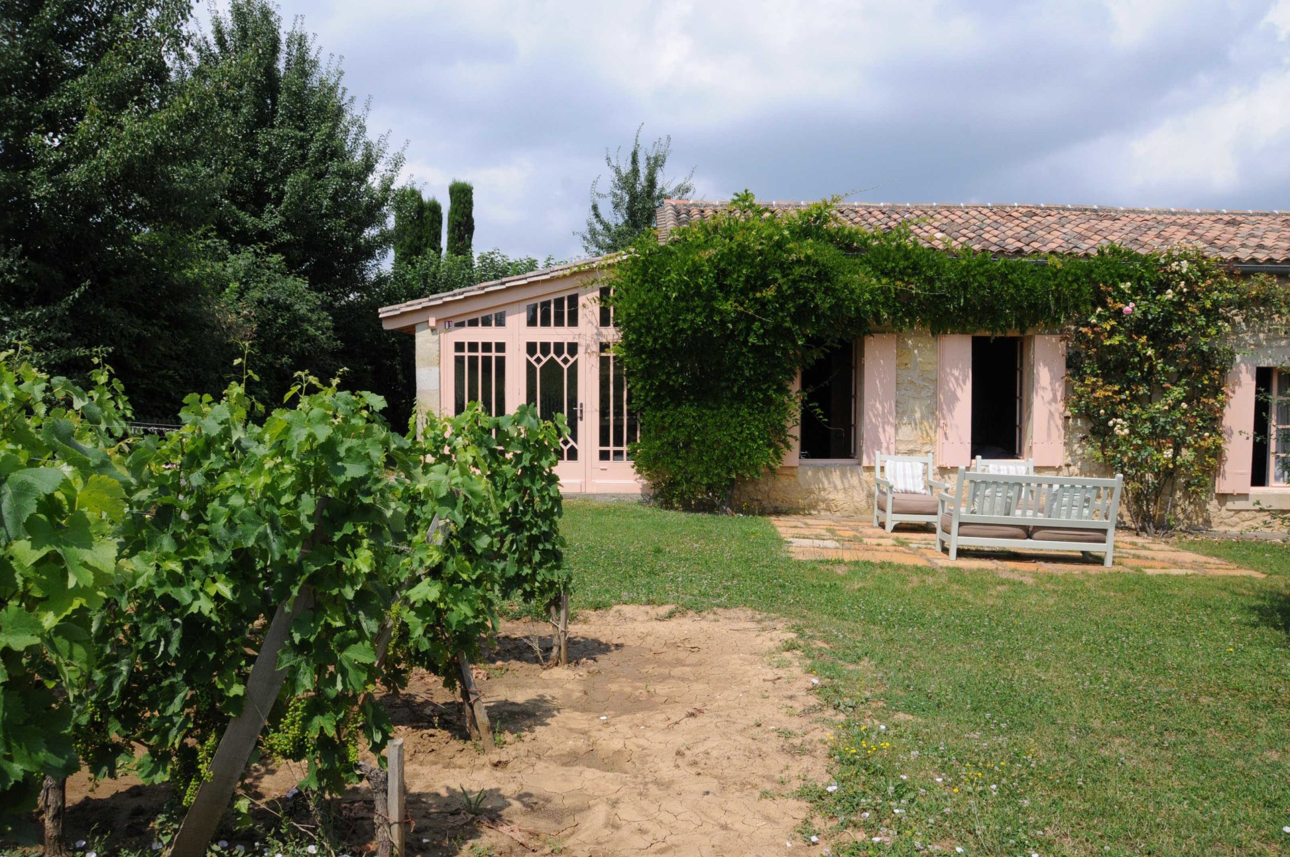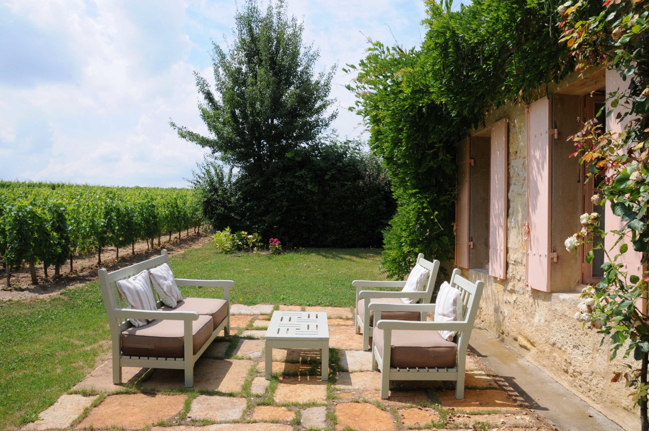 … mais à la belle saison et quand le temps le permet, un repas sur la superbe terrasse dominante, surplombant les vignobles et la vallée de la Dordogne, est un must! (remarquez en passant comme les dossiers des fauteuils sont sympas!)