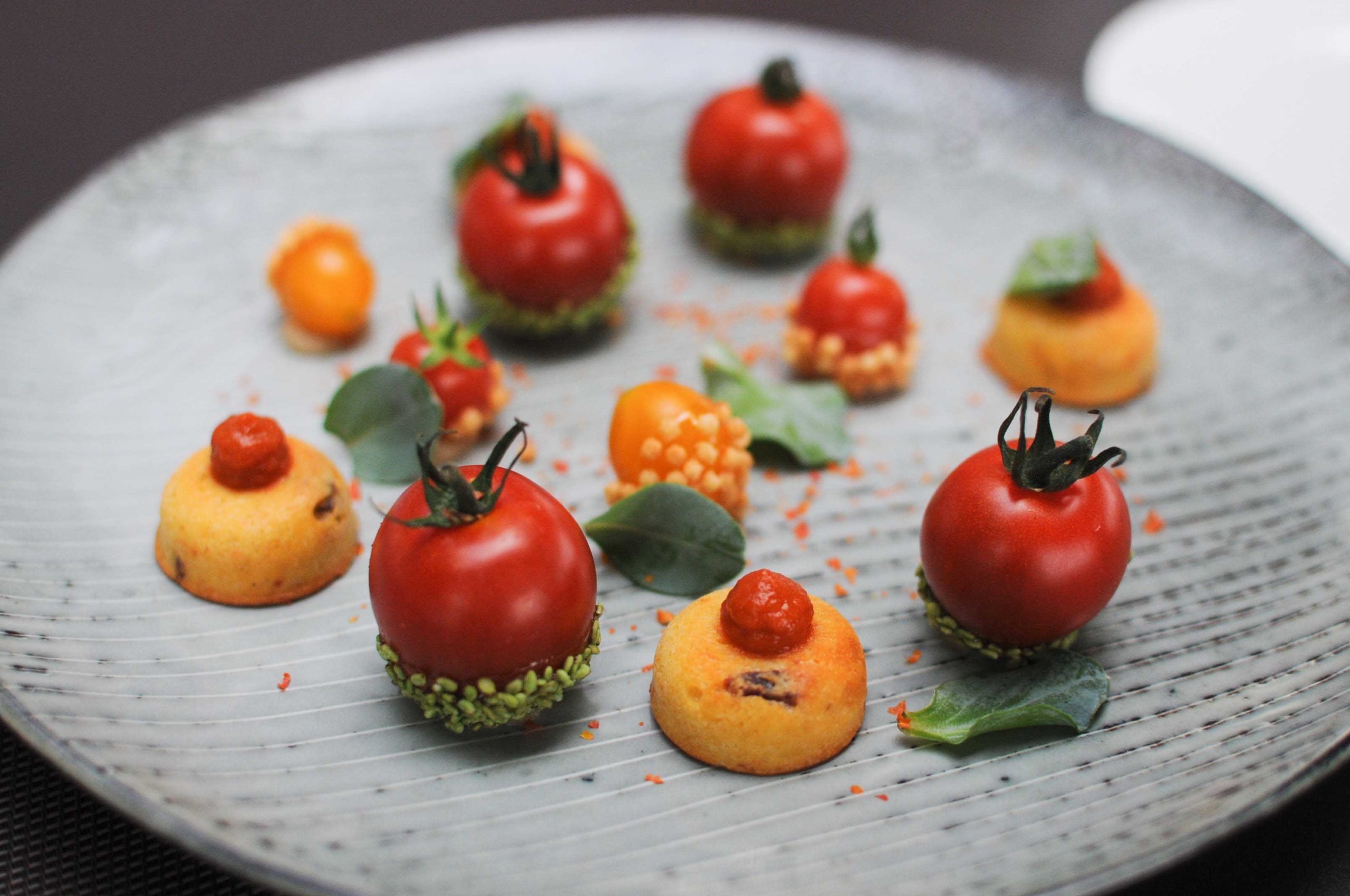 Madeleines au chorizo, coulis de poivrons; tomates caramélisées sésame wasabi; tomates jaunes caramélisées au riz soufflé