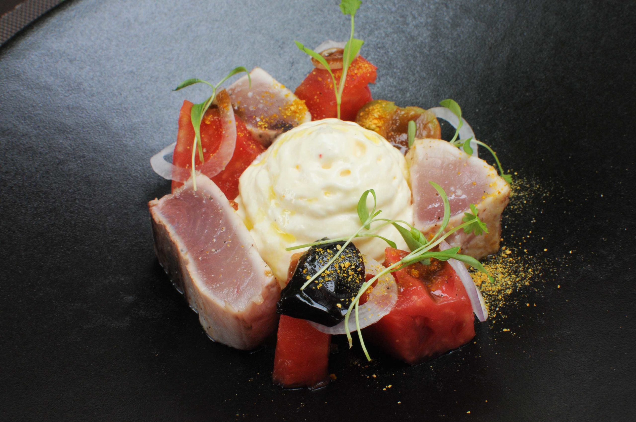 Thon blanc de Saint-Jean-de-Luz mi-cuit, tomates du pays, burrata en mousse légère et crumble parmesan
