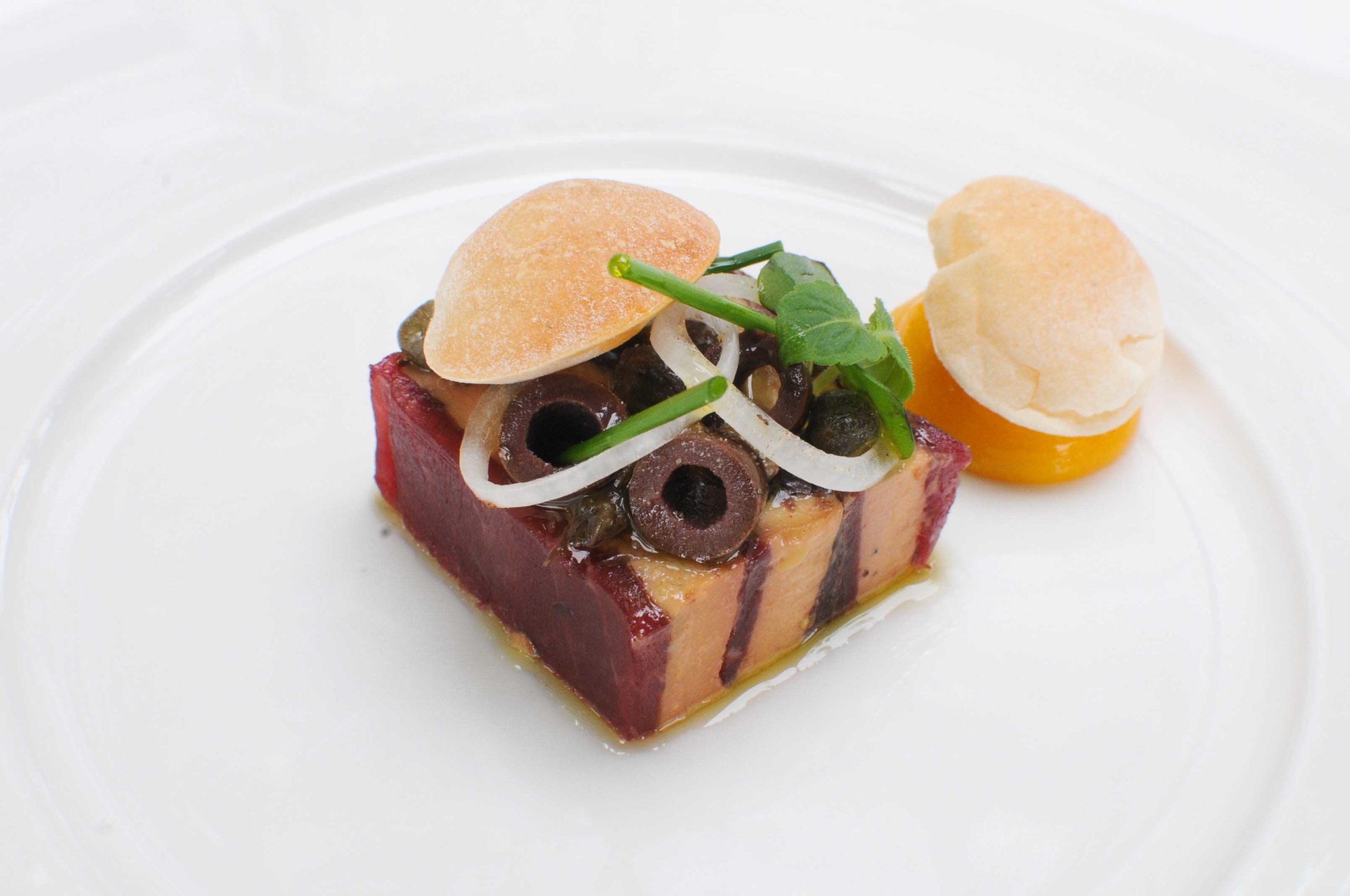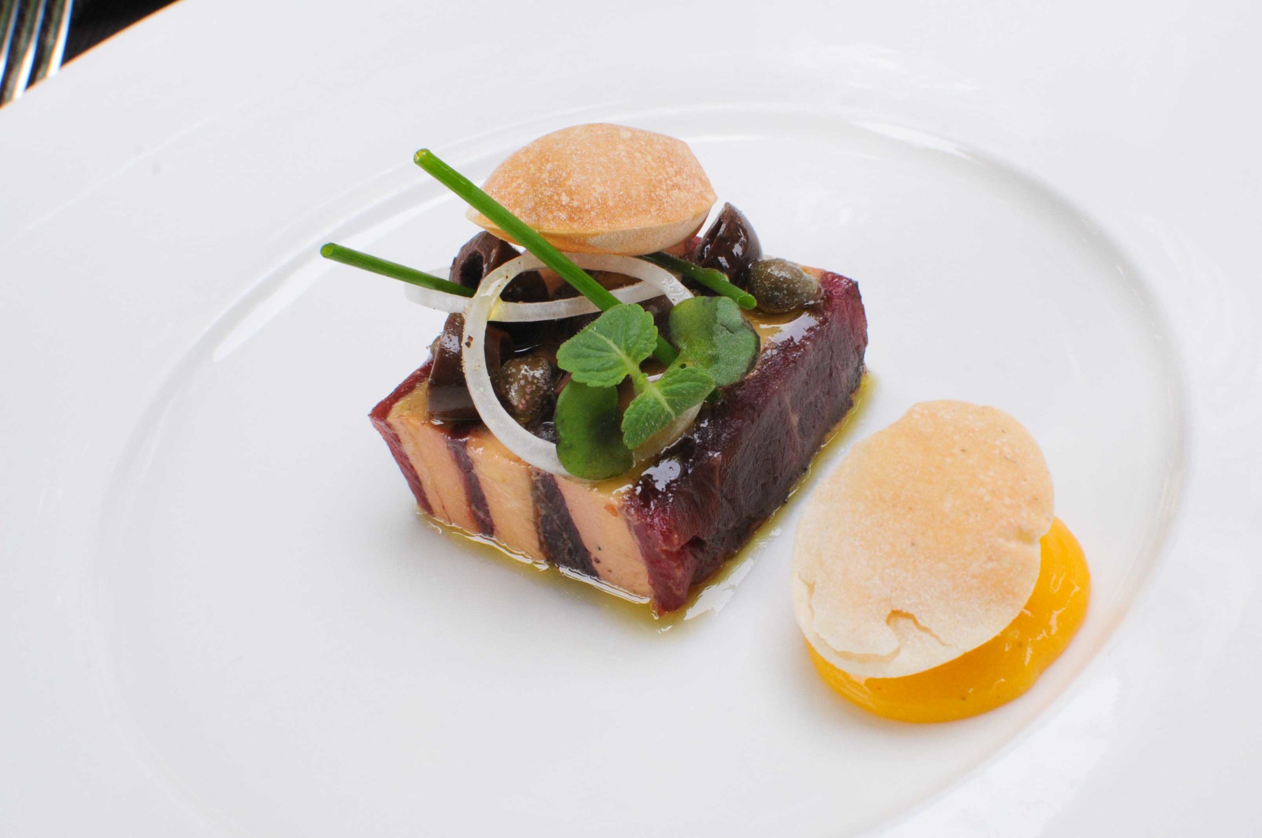 Pressé de boeuf Label Rouge du Périgord et foie gras marinés aux olives noires, jaune d’oeuf et pain soufflé, câpres et oignons nouveaux