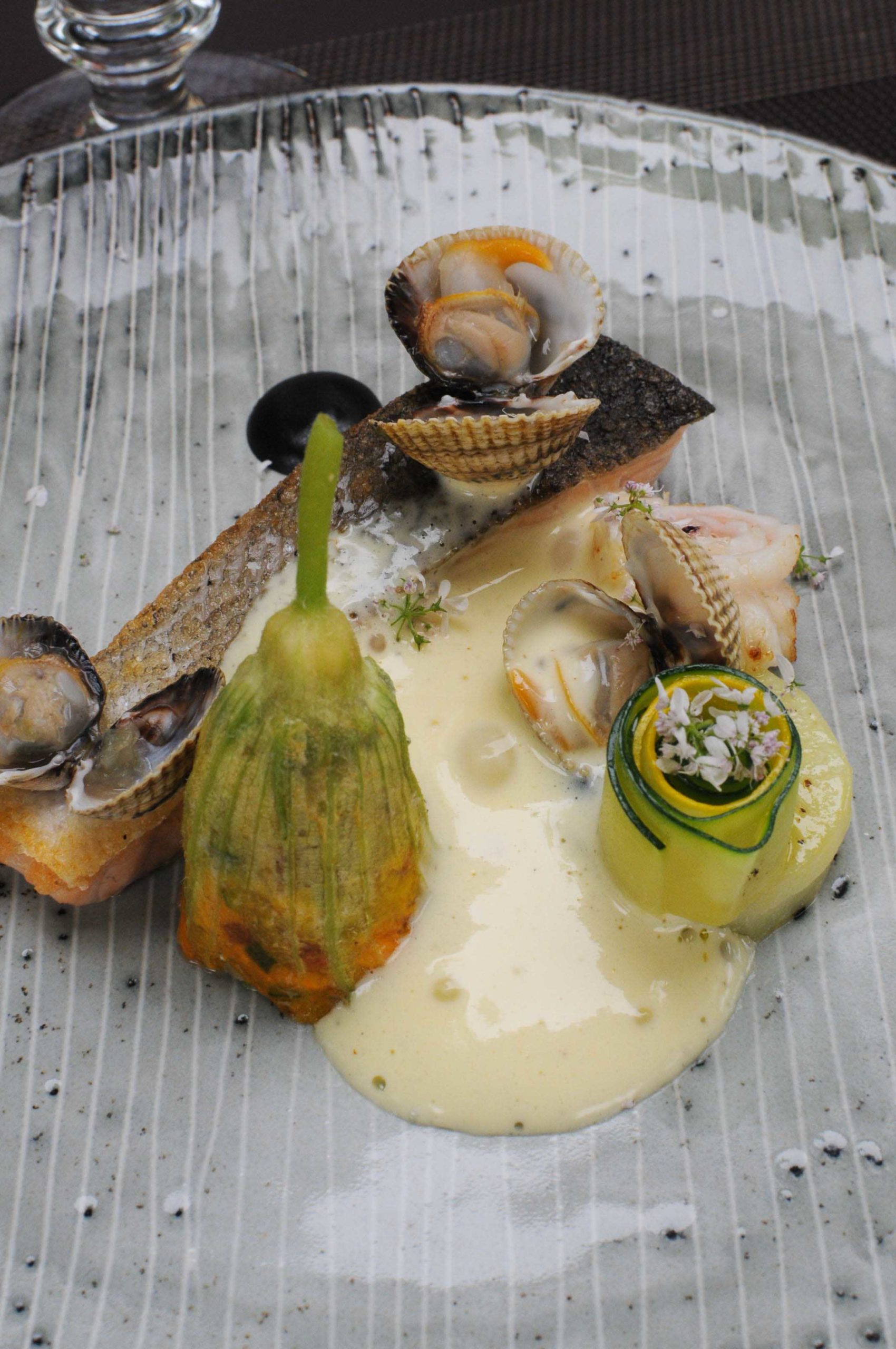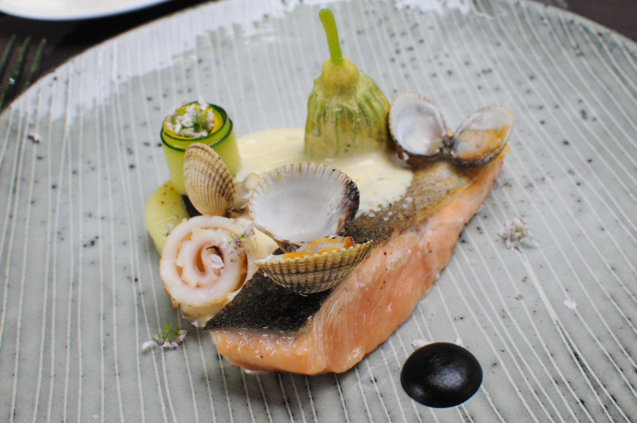 Truite de Banka confite sur la peau, fleur de courgette de pays farcie, pommes de terre amandine nouvelles, coques et encornets, condiment olives-anchois et hollandaise légère au yuzu