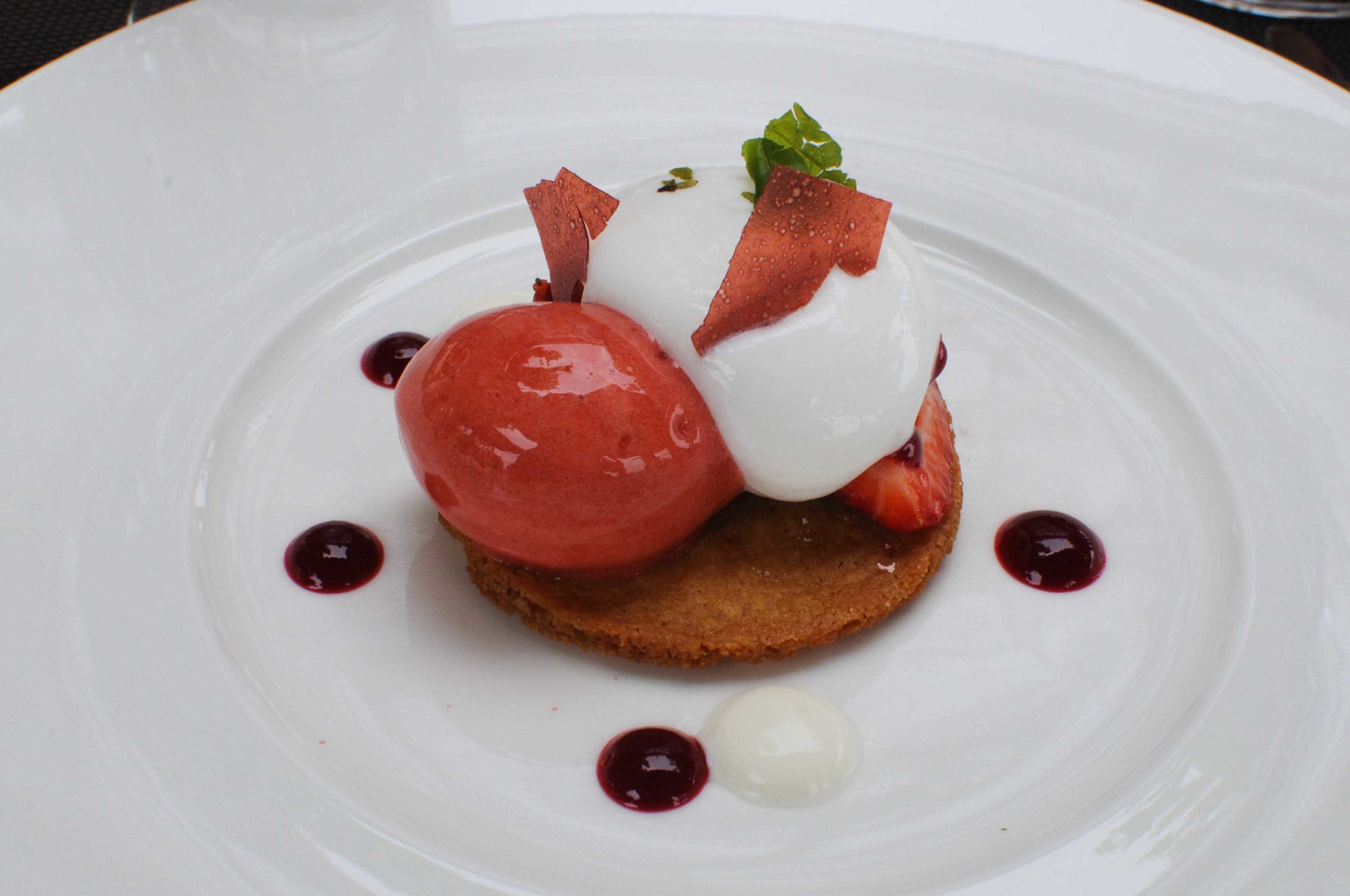 Fraise gariguette, mousse légère à la verveine, sablé breton et sorbet fraise