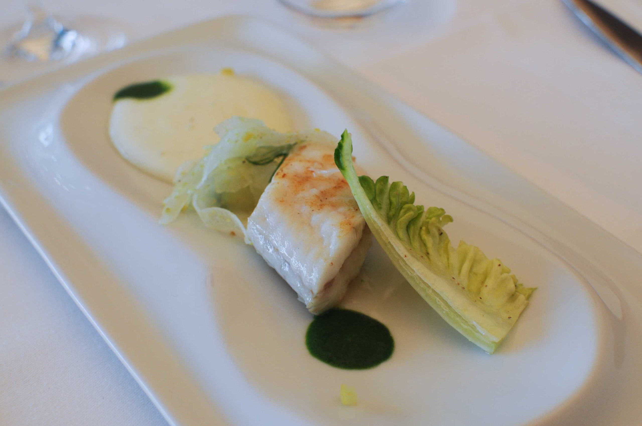 La sole est cuite à l’étouffée puis grillée, la mousse de pomme de terre fumée semble tout droit sortie du siphon, c’est excellent; fenouil et douceur de l’aneth en coulis pour équilibrer, c’est très bien.