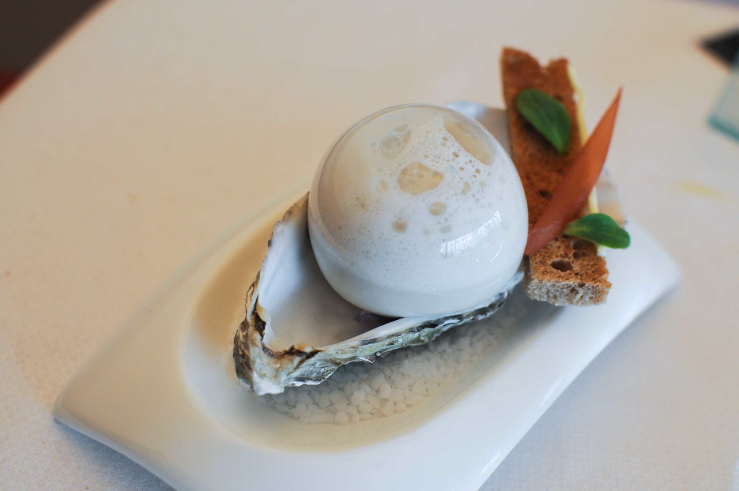 Dans un esprit ludique et inventif, Jacques Decoret a mis au point cette huître mythique il y a déjà plus d’une dizaine d’années. Telle une énorme perle, la bulle est à prendre en bouche et il faut la faire exploser par pression entre le palais et la langue pour avoir toutes les saveurs de la mer… le goût de l’huître sans l’huître (ou presque). Pain de seigle, échalote et feuille de bourrache pour renforcer le goût marin, magique!