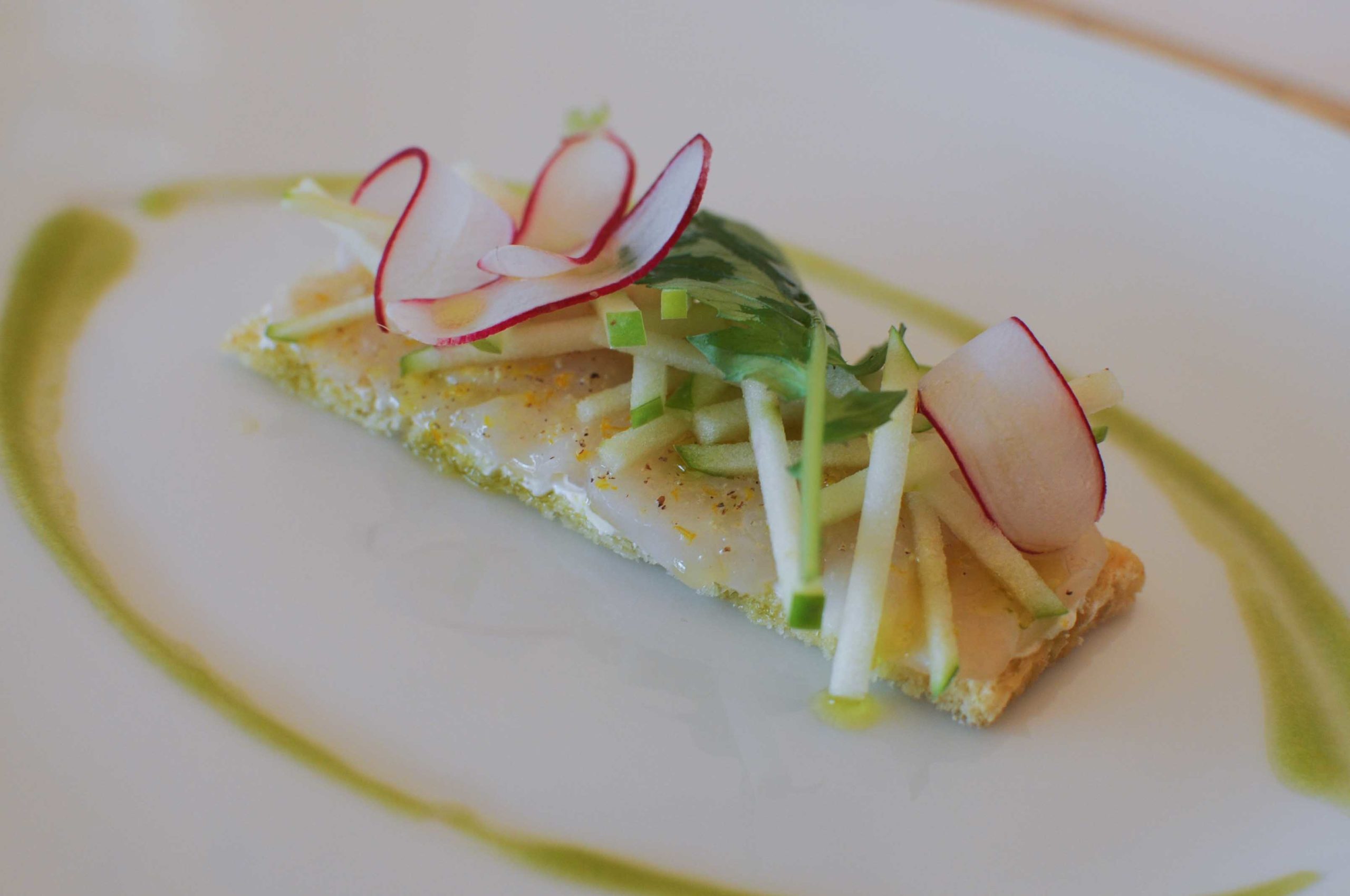Les Saint-Jacques sont coupées en carpaccio sur une fine tranche de pain de seigle. Pommes vertes, wasabi léger, crème fraîche, couleur, acidité, des associations qui marchent bien.