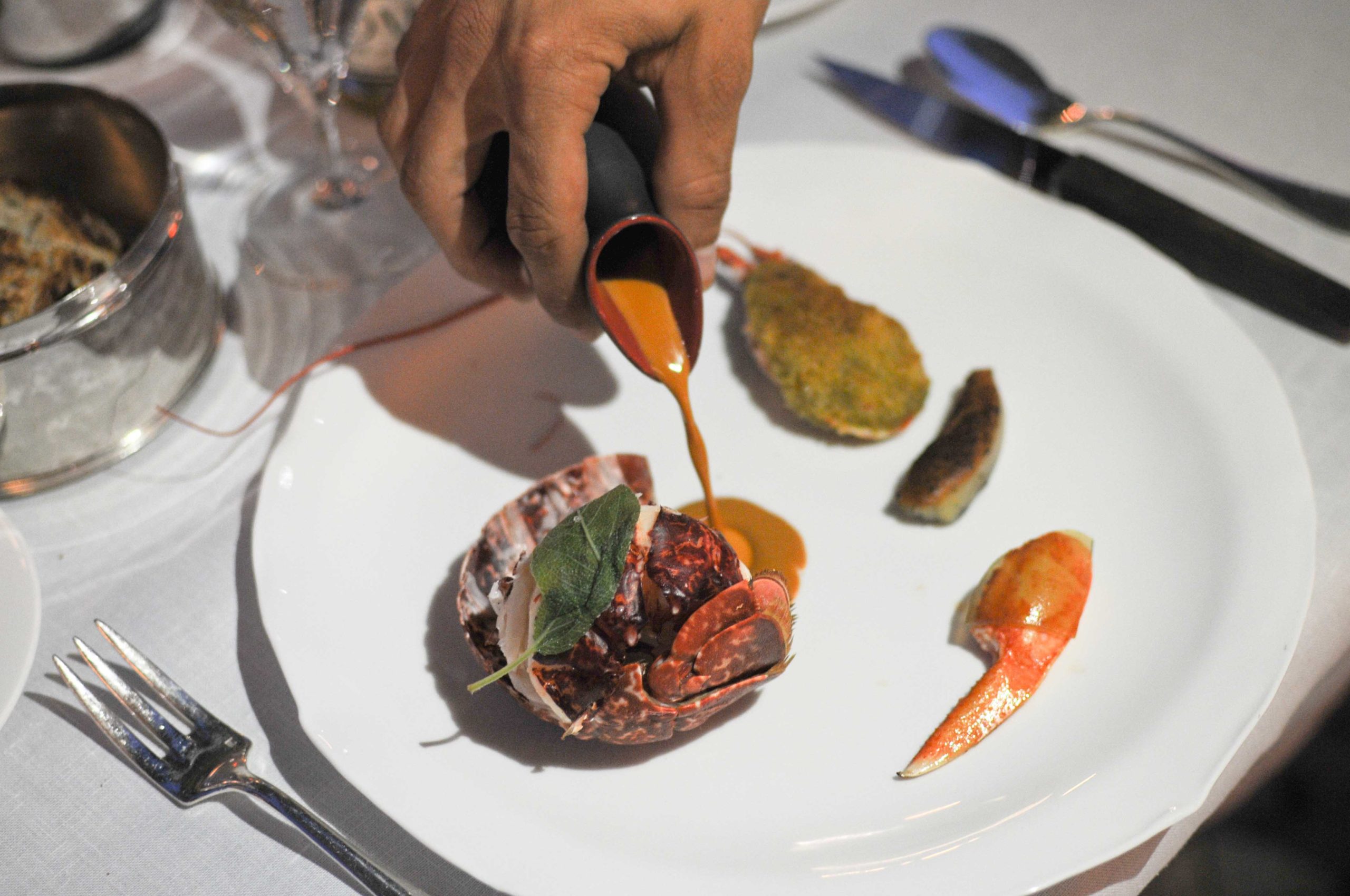 Le homard cuit en cocotte et légèrement fumé aux herbes de Provence est présenté au client avant d’être découpé. Servi avec une bisque de homard très concentrée en sucs, la chair est parfumée, c’est un régal pour les papilles qui apprécient aussi la parfaite cuisson. La tête est farcie avec une fricassée de fenouil, l’ensemble est réalisé avec une parfaite maîtrise, un très très beau plat.