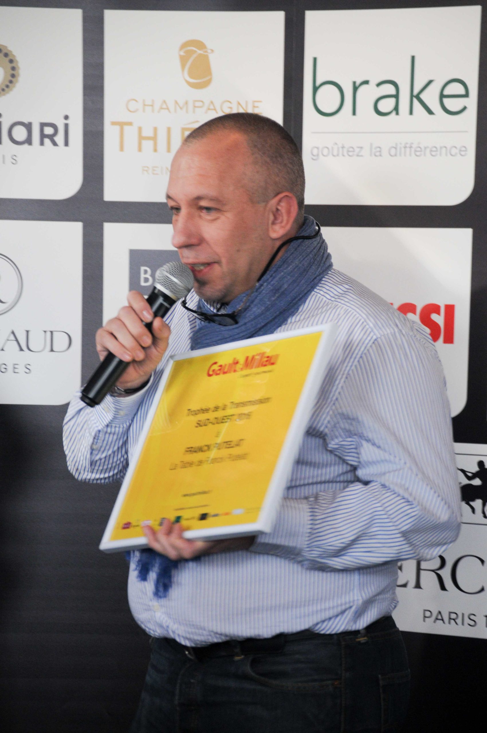 On commence les dotations avec le Trophée de la Transmission attribué à Franck Putelat, Chef de La Table de Franck Putelat à Carcassonne (4 toques 17/20)
