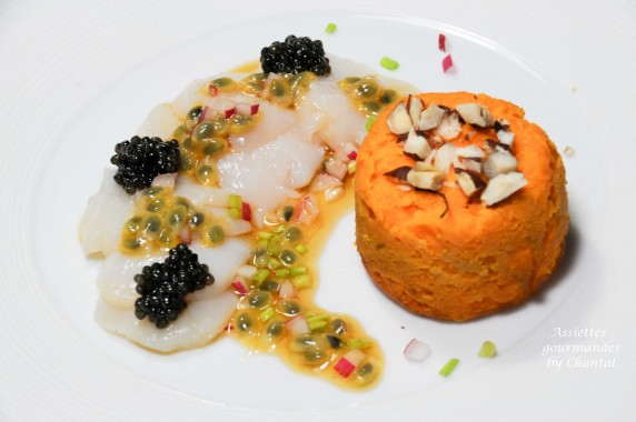 En regardant des recettes de Marcel Ravin (Chef martiniquais du Restaurant Blue Bay à Monaco), je suis tombée sur une recette Saint-Jacques et royale de topinambour… mais pas de topinambour chez mon primeur, alors changement de programme, ce sera royale de patate douce, ça devrait l’faire aussi!