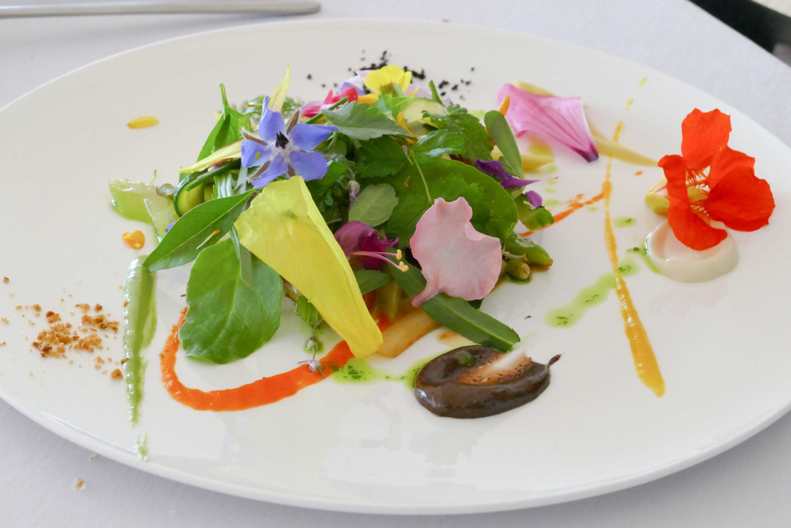 Le Gargouillou est un véritable feu d’artifice qui se renouvelle sans cesse au gré des saisons; pas vraiment de recette mais un assemblage judicieux de jeunes pousses de légumes, graines et fleurs: fougères, amarante, mouron des oiseaux, pensée, ciste, menthe, courgette, artichaut, poivron… (jusqu’à 80 variétés différentes dans une seule assiette!)