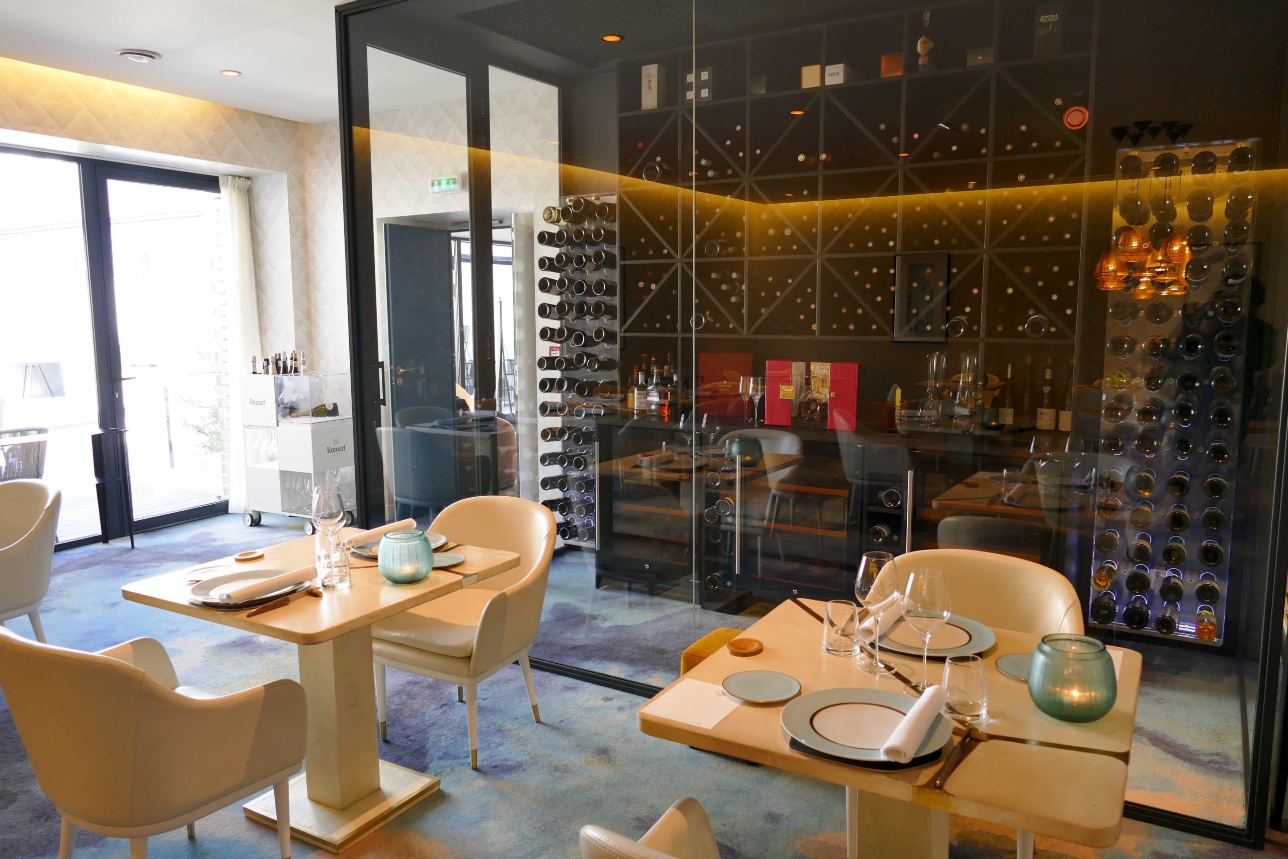 La salle du restaurant est superbement pensée : à la fois largement ouverte sur les cuisines et sur une très belle cave contemporaine: