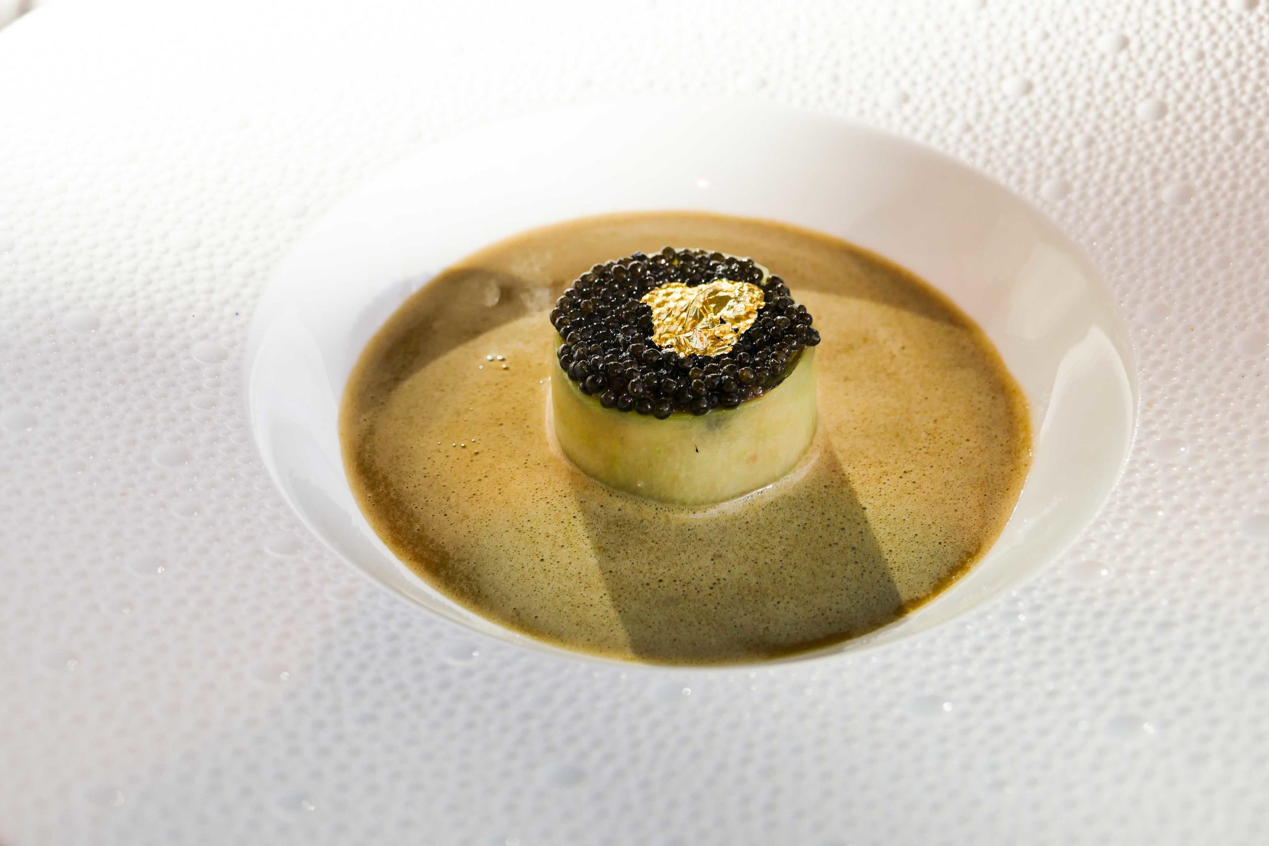 Crabe vert du bassin : soupe liée au pain d’épices, chair de crabe, gelée Kafir et caviar d’Aquitaine