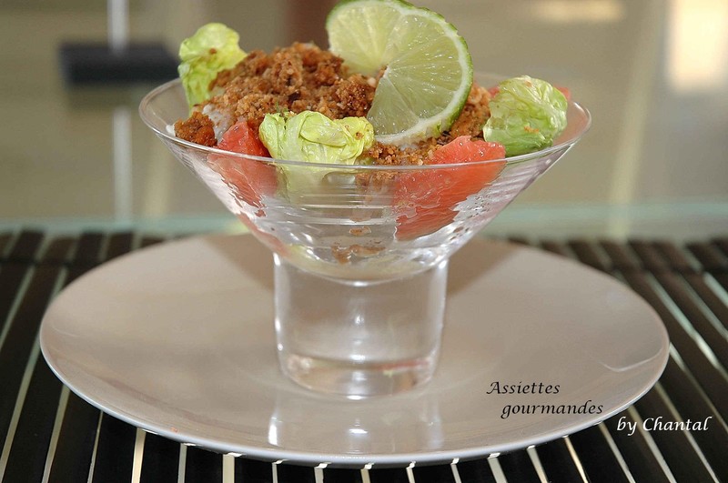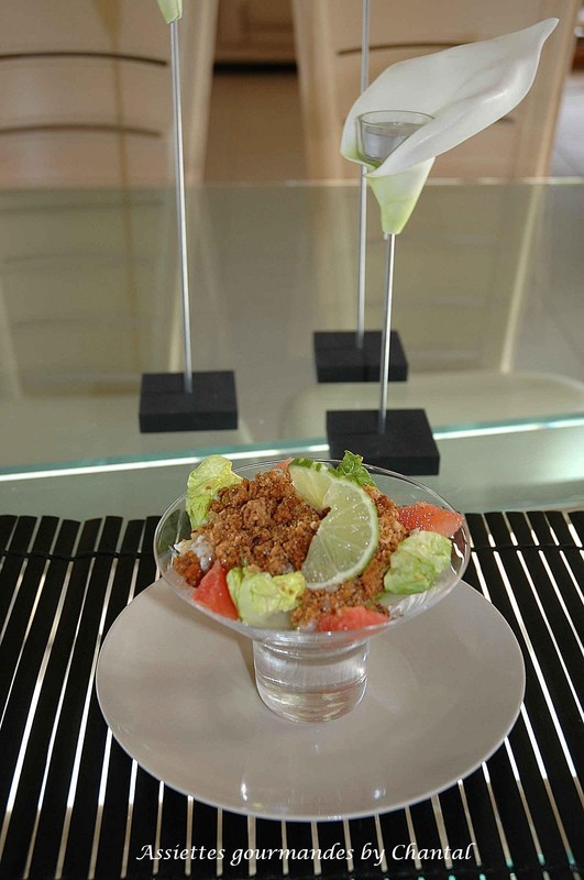 C’est très beau tout ça, mais il faut les remplir ces coupes! Alors, j’ai cherché et trouvé une recette de « crumble de dorade royale » (chez cuisinerenligne) que j’ai testé et qui m’a donné toute satisfaction.