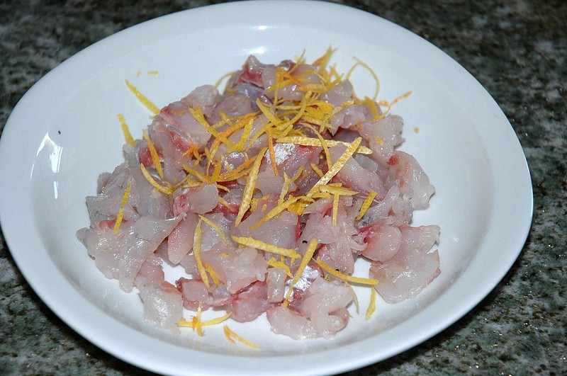 Détailler les filets de poisson en petits cubes comme pour un tartare.( le plus difficile était d’enlever la peau des filets, je pense que la prochaine fois je prendrai des filets de grenadier ou autre poisson blanc).