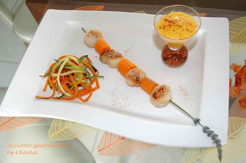 Il s’agit d’une brochette de Saint-Jacques (une tige de lavande faisant office de brochette), accompagné d’une émulsion carotte-cumin (là où intervient mon siphon), et d’une julienne carottes courgettes…ça permet à ma mandoline de prendre l’air également…!