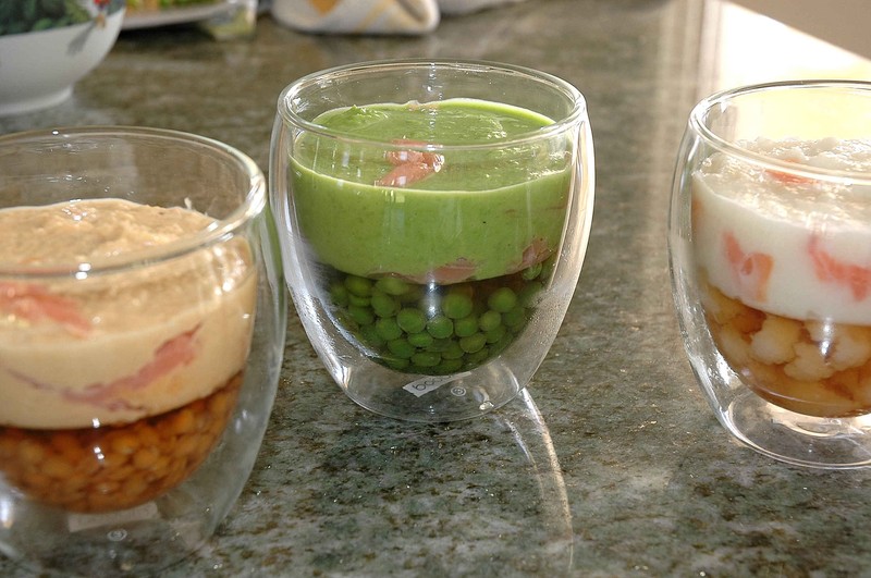 Une photo de verrine dans un livre spécialisé sur le hareng…. il n’en faut pas plus pour s’en inspirer et se lancer dans une déclinaison de légumes soit entiers, soit réduits en purée et de l’adapter avec quelques lanières de saumon fumé en substitution du hareng.
