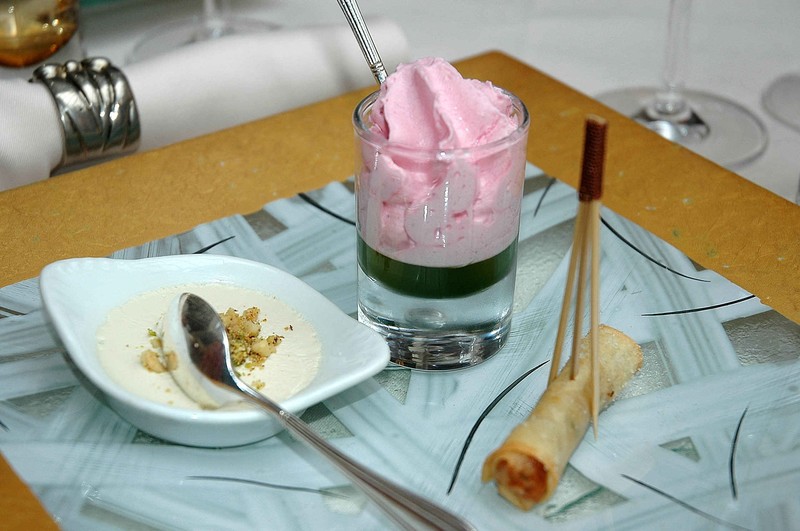 Crème brûlée au foie gras, gelée de persil mousse de betterave, nems canard légumes
