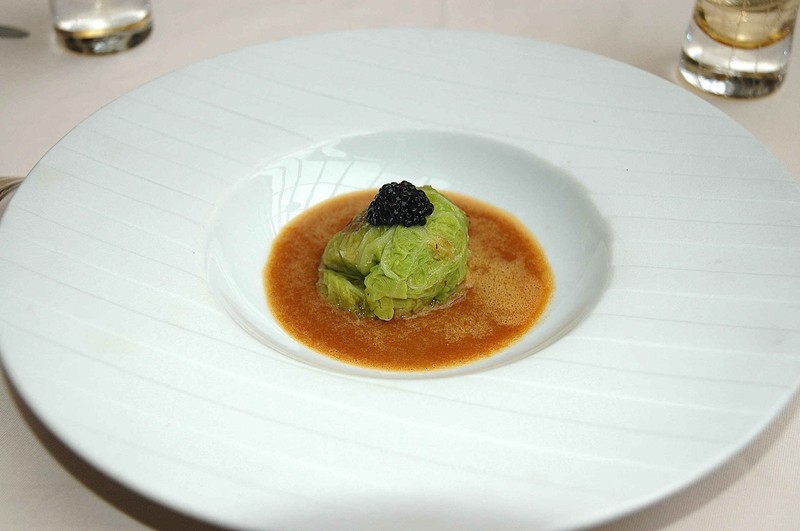 Petit chou farci aux coquillages et crustacés et son petit bouillon, caviar d’Aquitaine