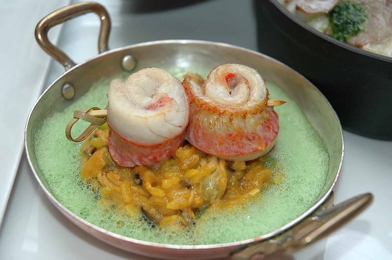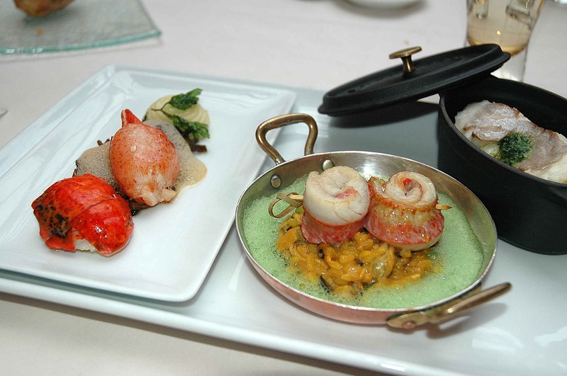 Homard rôti en carapace, gâteau de nouilles au ris de veau, filets de rouget rôti paëlla de coquillages, filet de bar au beurre d’herbes ragoût d’artichaut et coques