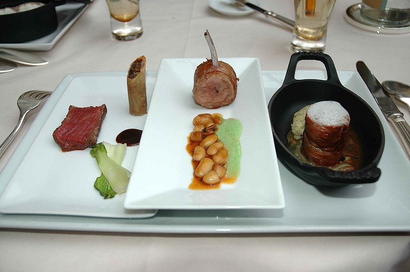 Filet de boeuf de l’Aubrac et nem de joue de boeuf, carré d’agneau de lait des Pyrénées farci, haricots tarbais au thym, filet mignon de cochon noir de Bigorre aux truffes