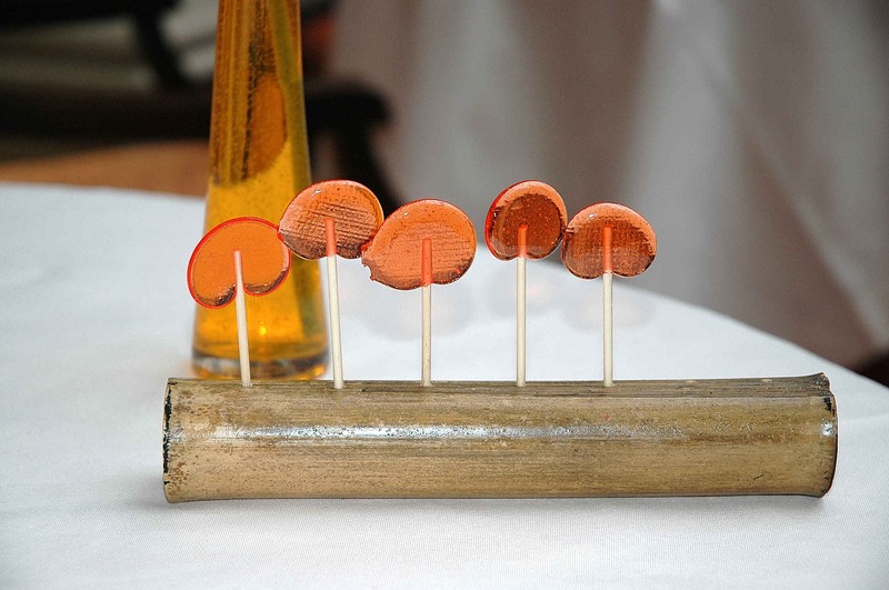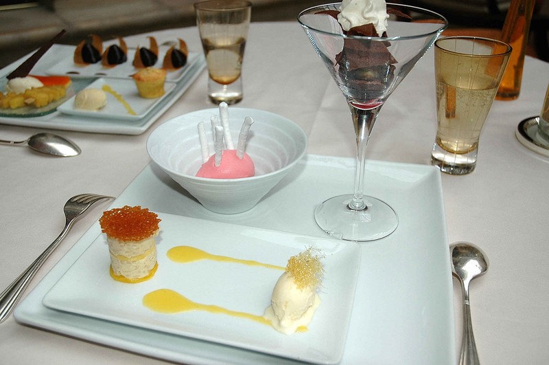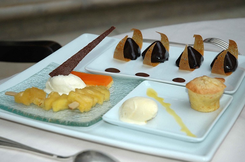 Pyramides de chocolat au pralin sauce chocolat au cigare tuiles croustillantes, biscuit moelleux agrumes et romarin, glace au gingembre, morceaux d’ananas au caramel de vanille et sablé breton, glace citronnelle, gelée carotte-orange