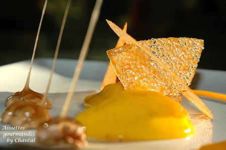 Vous vous souvenez des tuiles au caramel réservées?… Les voici qui entrent en jeu pour décorer de manière originale cette assiette!