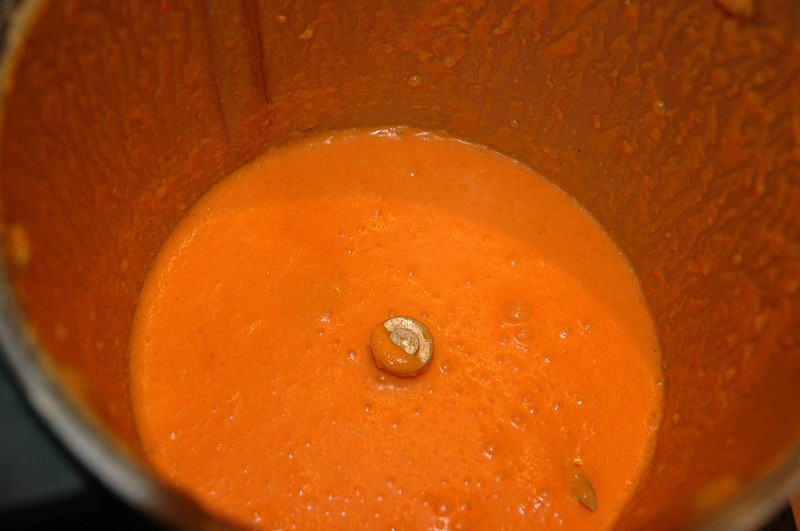 Mixer finement les ingrédients pour le velouté dans un blender ou Thermomix (environ 200 g de piquillos égouttés).
