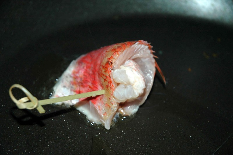 Enrouler un filet de rouget autour d’une queue de langoustine, maintenir avec une pique en bambou puis poêler dans un filet d’huile d’olive au dernier moment.