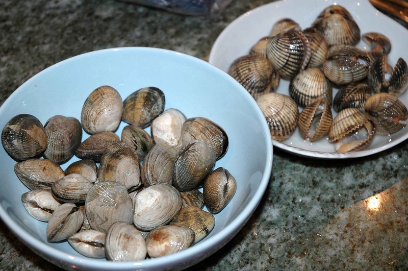 Nettoyer et rincer les palourdes et les coques à grande eau afin d’éliminer toute trace de sable… pas très agréable d’avoir des craquements sous la dent ;-))