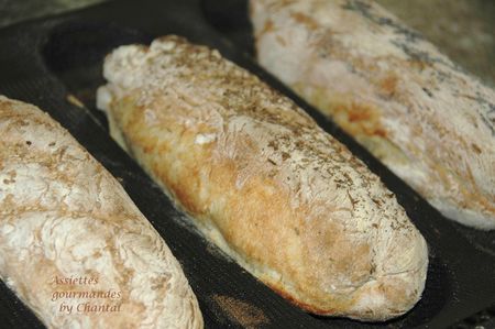 La pâte est assez molle, j’ai placé les pains dans un moule qui a l’avantage de renforcer le croustillant de la croûte du pain. Sinon, disposer les pains sur du Silpat ou sur du papier sulfurisé.