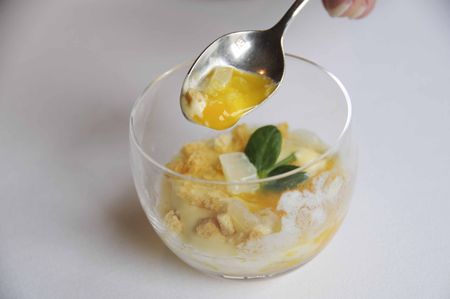 Dans cette verrine, la cuillère qui va plonger jusqu’au fond va trouver une tombée d’endives, une sauce hollandaise au siphon et un jaune d’oeuf cuit à 64 °C pendant 1 heure.