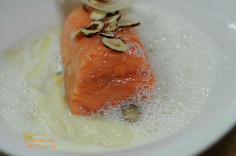 Saumon basse température, purée d’artichaut à la truffe et lait mousseux au Parmesan