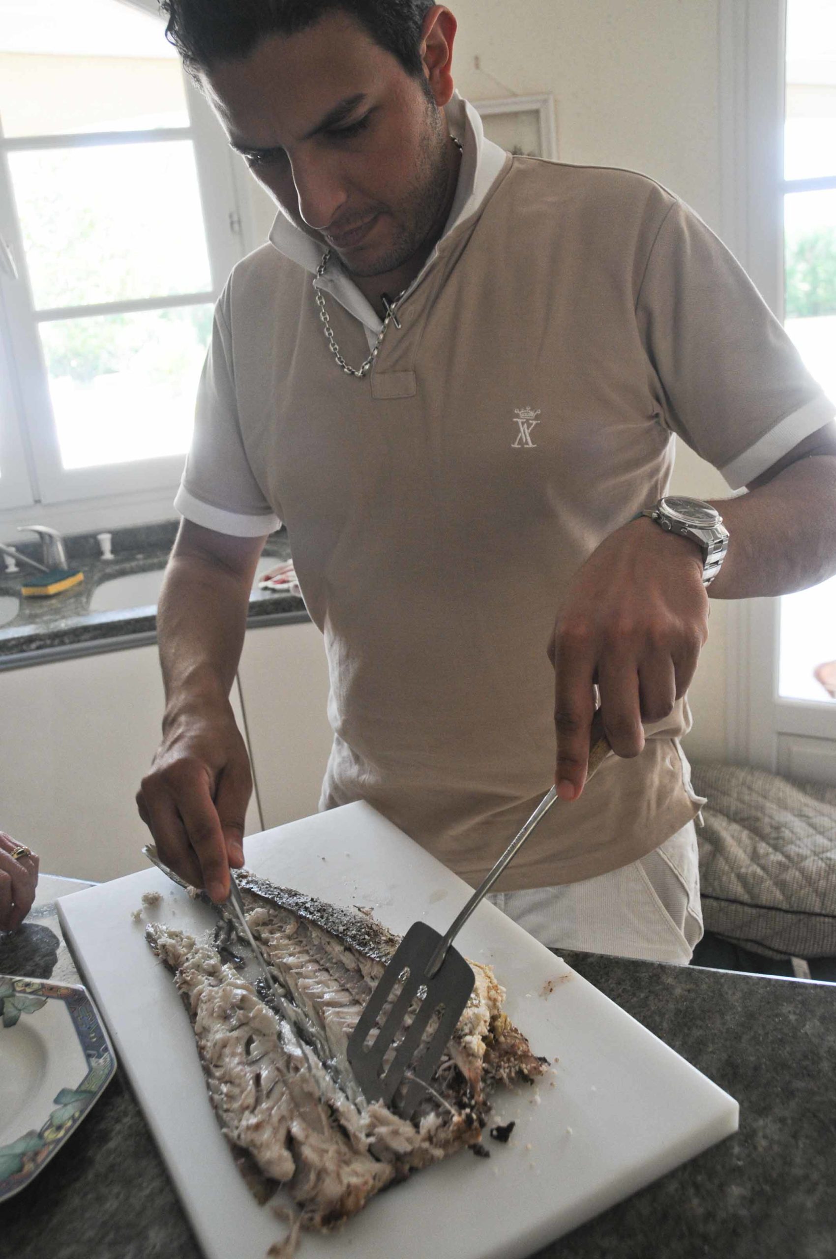 Là, bêtement vous vous dîtes que le bar ne va pas rentrer dans votre four, qu’il déborde démesurément de la lèchefrite du four! Une seule solution: le « raccourcir »! Chef Akrame qui a quitté la cuisine de son restaurant pour le WE n’a pas de chance, c’est lui qui a la charge d’étêter la bête 😉