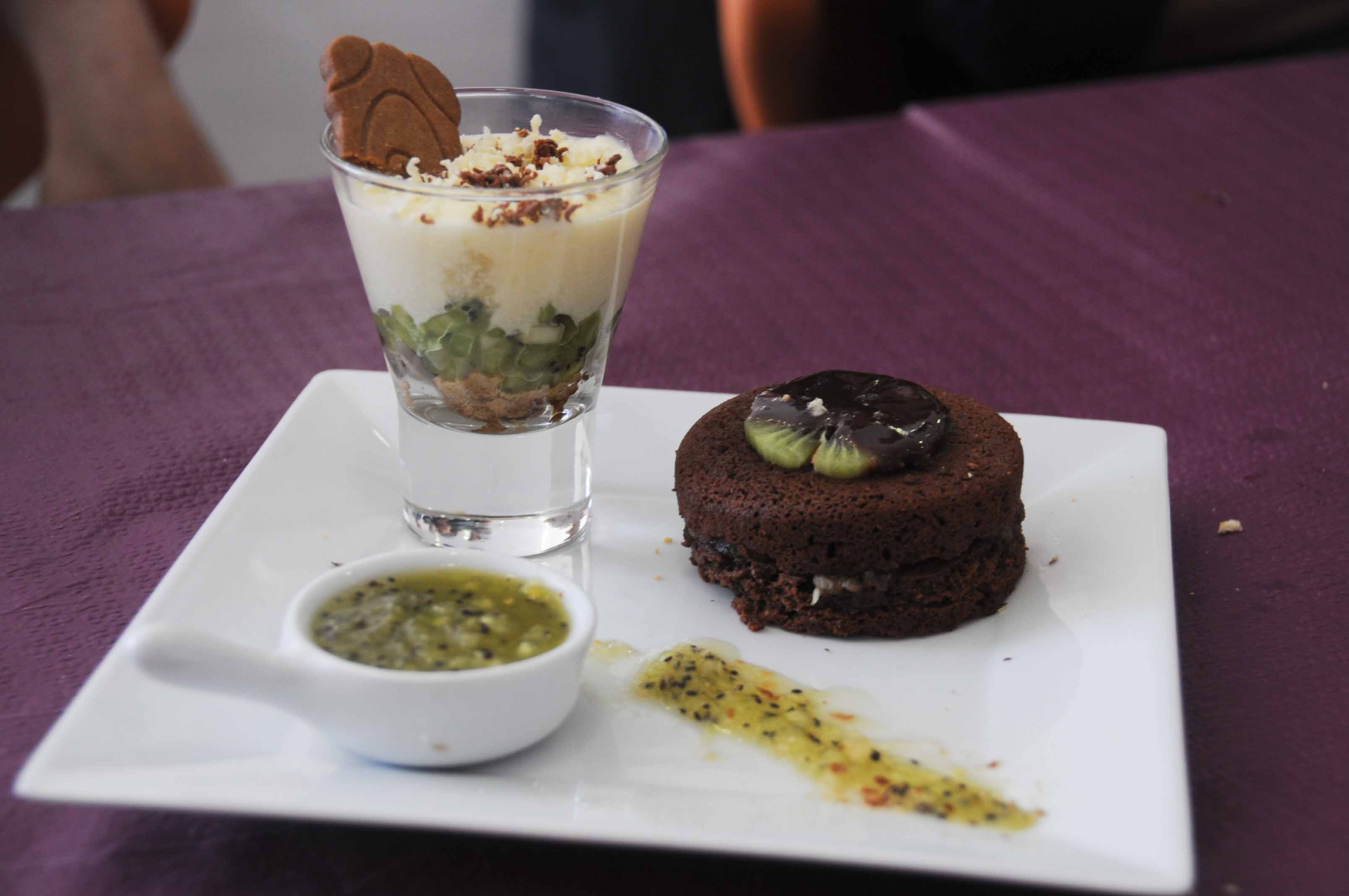 Une heure plus tard, voici les desserts chocolatés réalisés en association avec la poire, la pomme, la banane, le kiwi, l’orange et le citron: