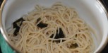 Cuire les nouilles chinoises dans une casserole d’eau salée. Mélanger les nouilles cuites avec quelques algues émincées.