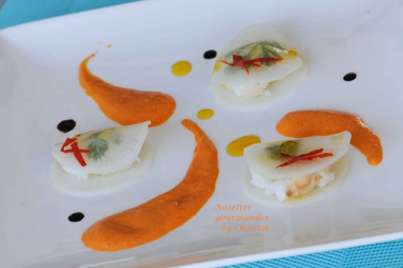 La recette et la photo du plat sont superbes.Que de travail pour un résultat aussi frais et aussi délicat… Le résultat est d’une grande finesse et d’une grande élégance.J’aime beaucoup l’idée de la sauce aux poivrons pour le goût et la couleur…
