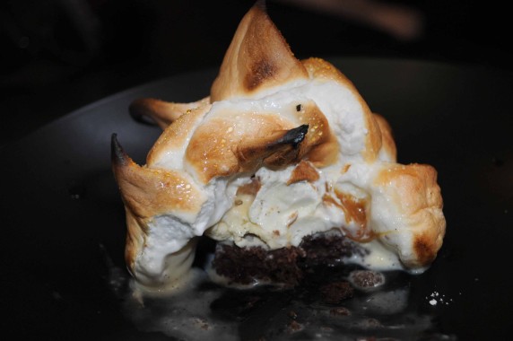 Plus en détail: Biscuit cacao, glace vanille caramel salé et meringue flambée au whisky fumé, top!