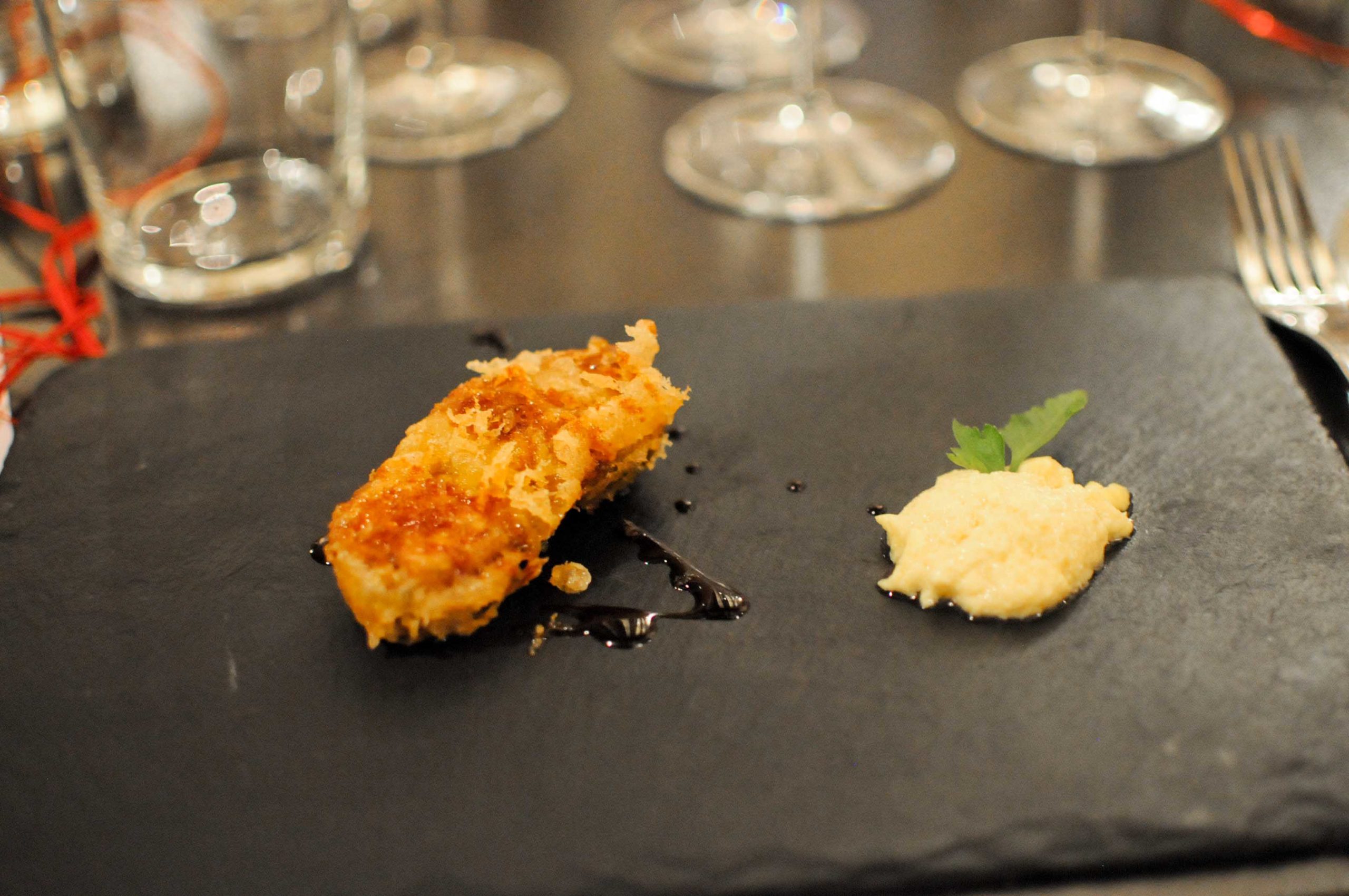 Escalope de foie gras chaud en tempura, caramel au vinaigre de canne à sucre, royale de maïs