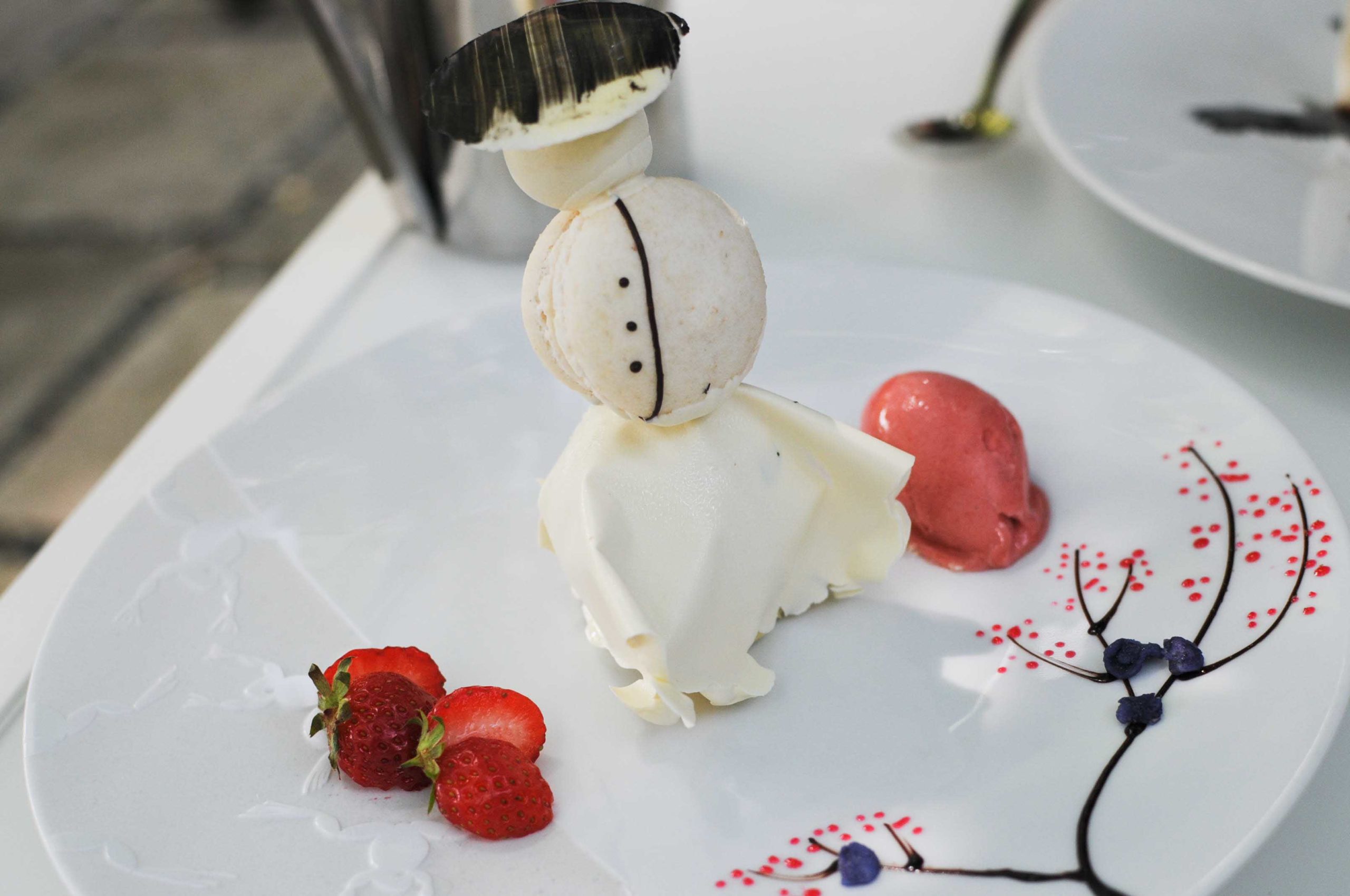 Une Dame Blanche aux allures de Geisha avec ce dessert décliné autour du chocolat blanc. Joli à l’oeil et très bon en bouche.