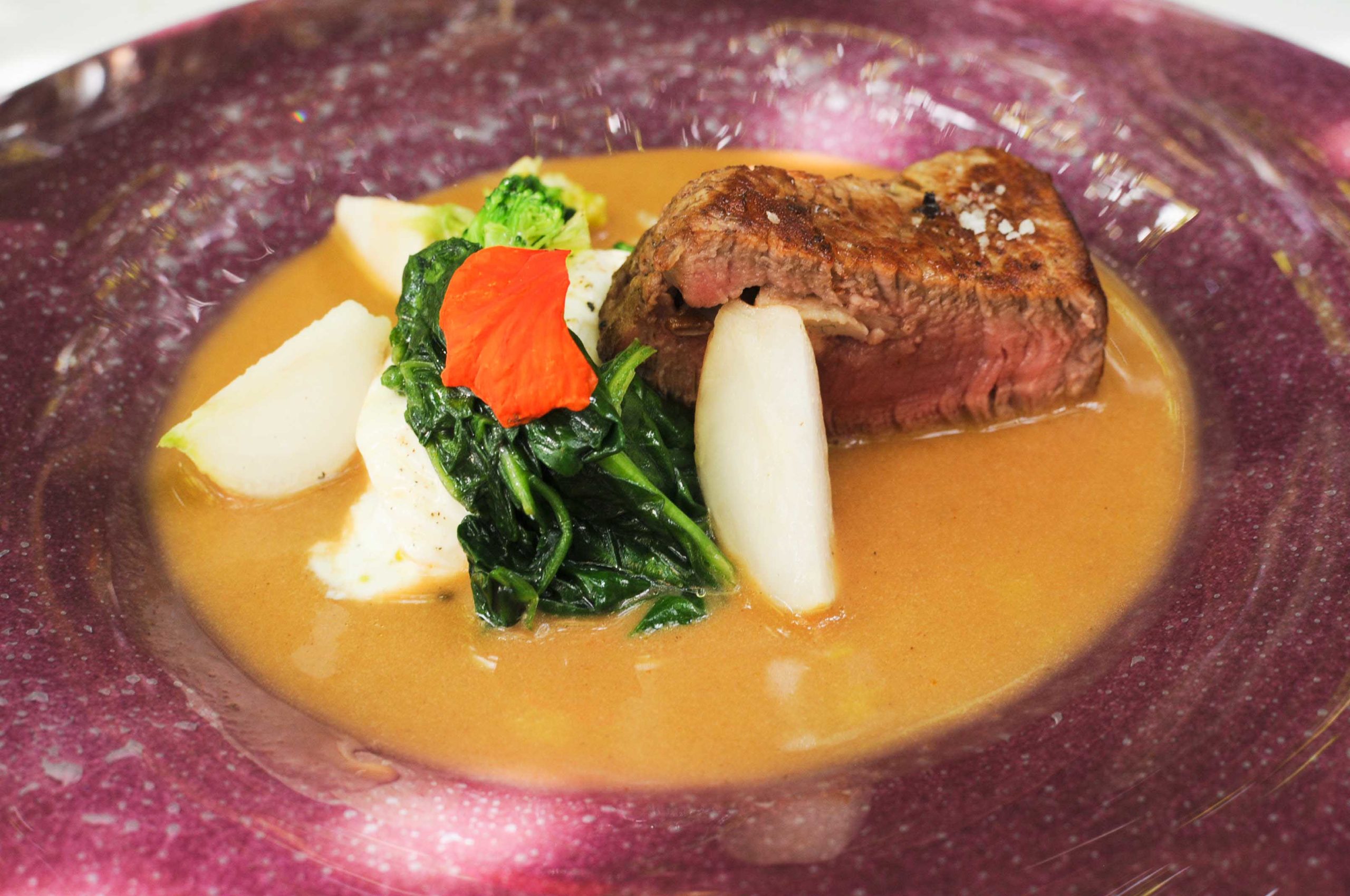 Filet de boeuf de Brière lardé d’anguille fumée, burrata crémeuse