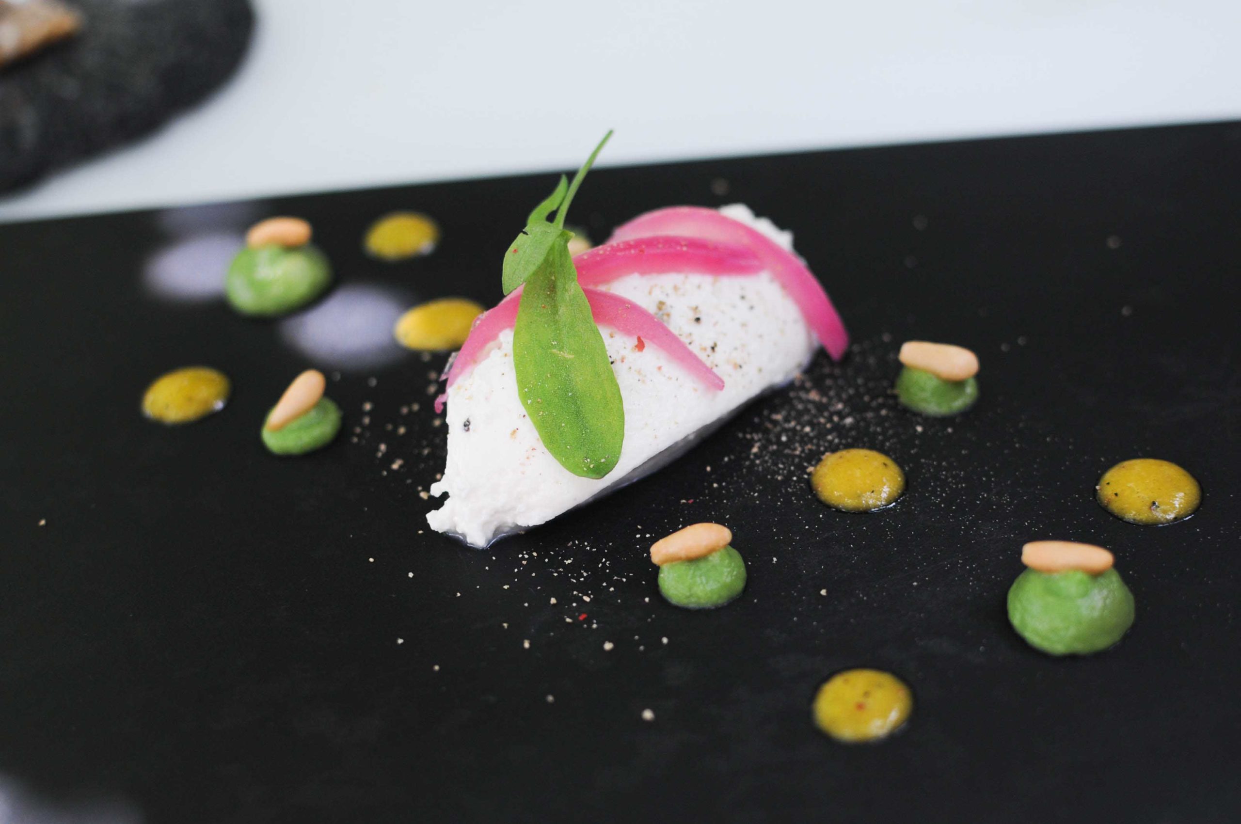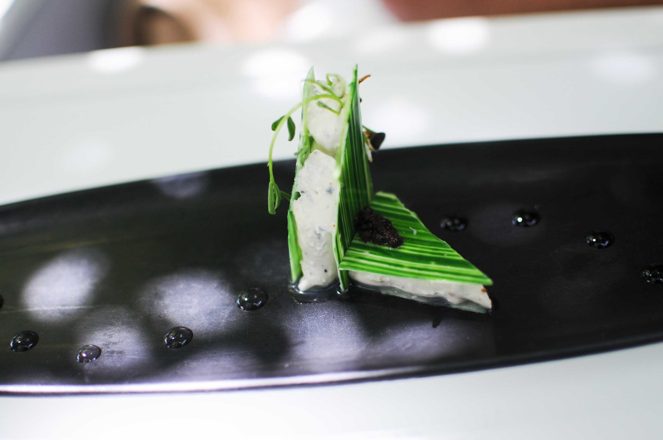 Le foie gras est grillé au BBQ puis mariné dans du Porto pendant 24 heures; en accompagnement, purée de pois gingembre, oignon grillé, feuille et fleur de cerfeuil, quelques pois frais et du riz soufflé. Les accords sont justes et équilibrés.