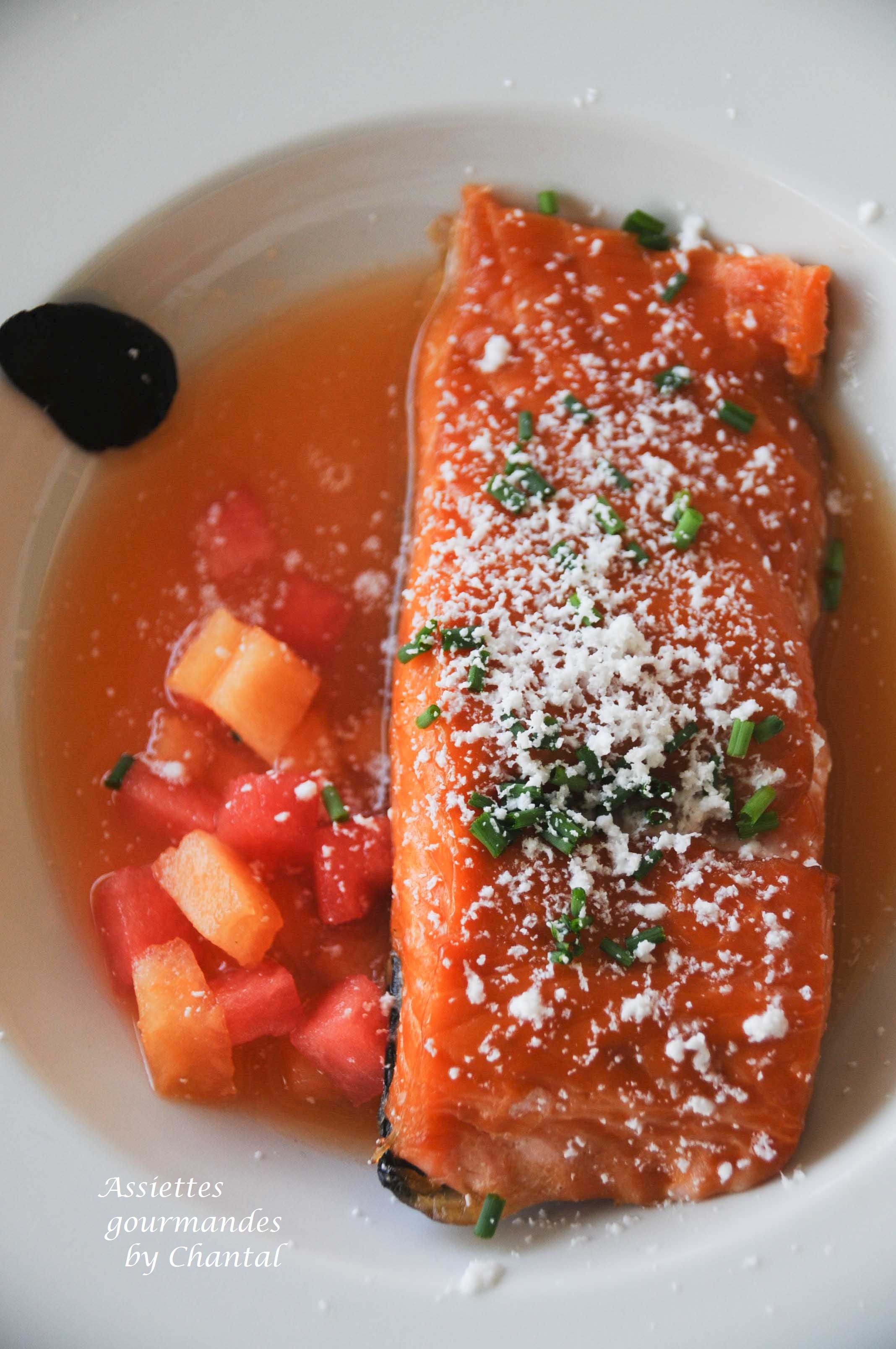 J’avais reçu il y a quelques temps du saumon de la Maison Delpierre et j’avais le souvenir d’une entrée très sympa autour du saumon et du melon l’été dernier au restaurant Passions & Gourmandises ; un melon dans le frigo, la chance d’avoir aussi de l’ail noir d’Aomori… on compose et on déguste!