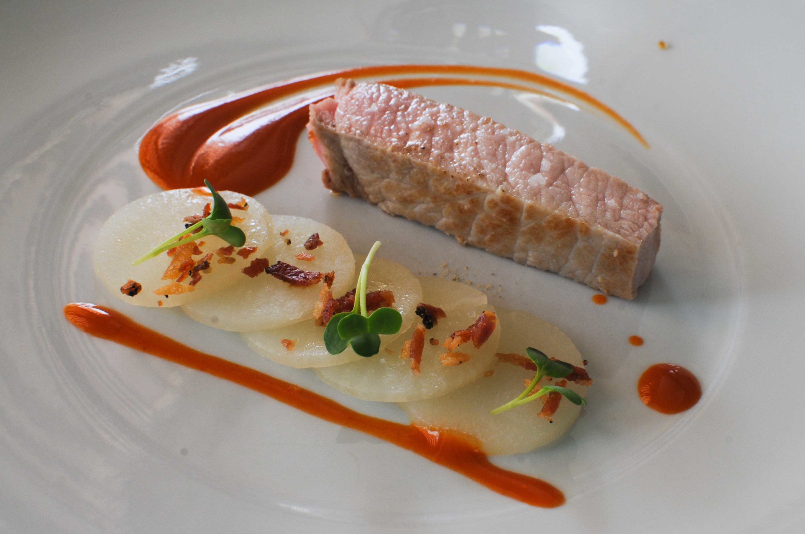Carré de porc de Cambès, navets aux lardons, jus de carottes