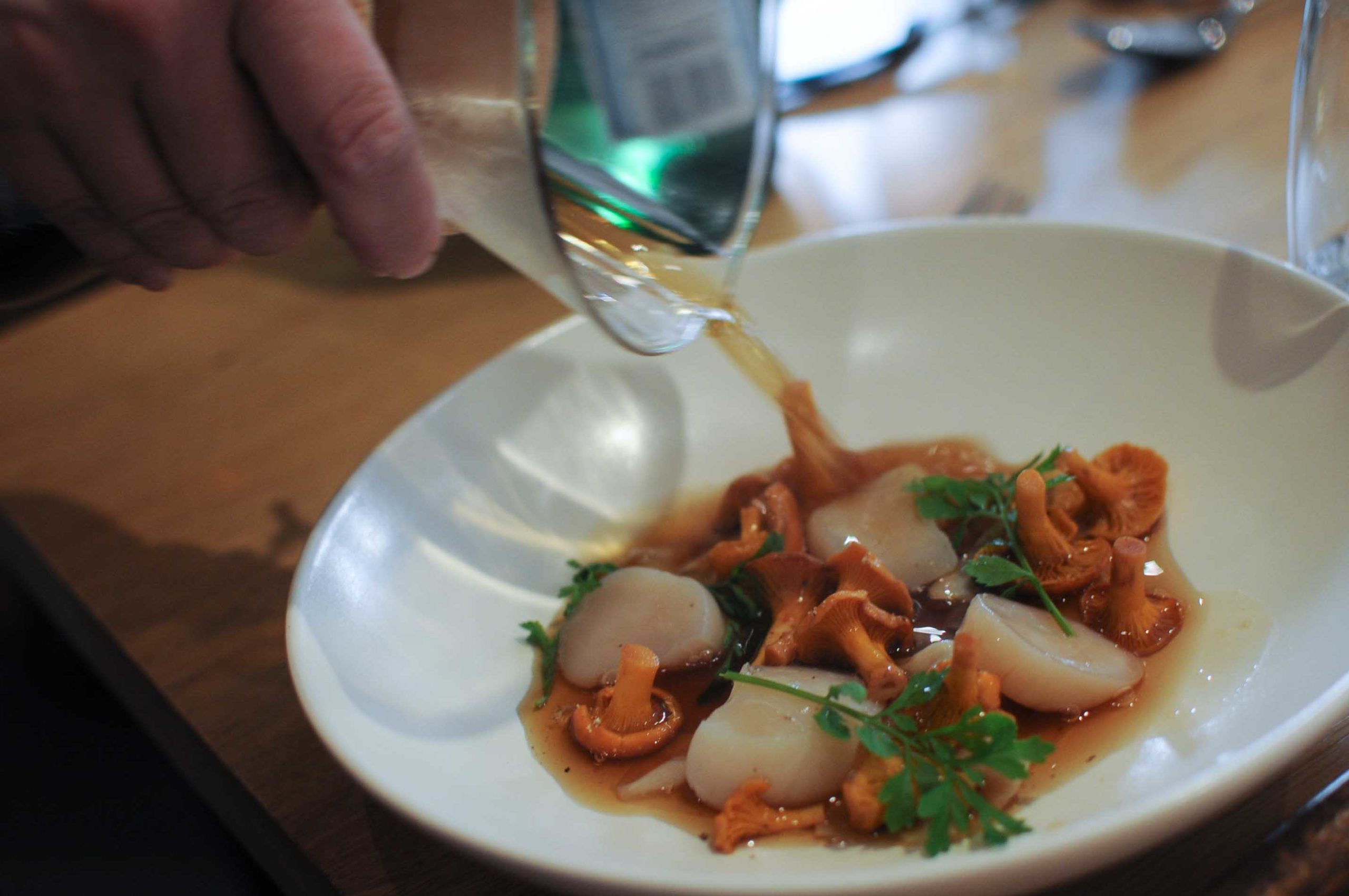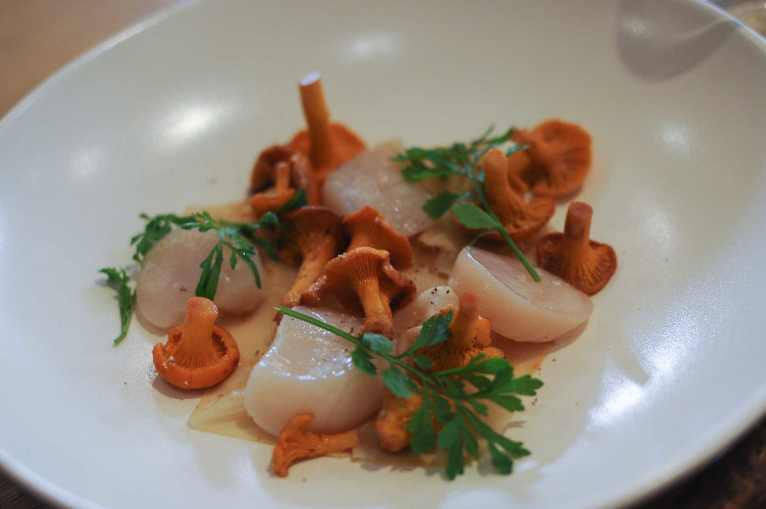 Là, c’est vraiment excellent, les Saint-Jacques crues sont saisies par le bouillon de carcasses de volaille bien relevé sans être trop puissant, de fines lamelles de céleri tranchées à la mandoline servent d’exhausteur de goût, c’est Top.