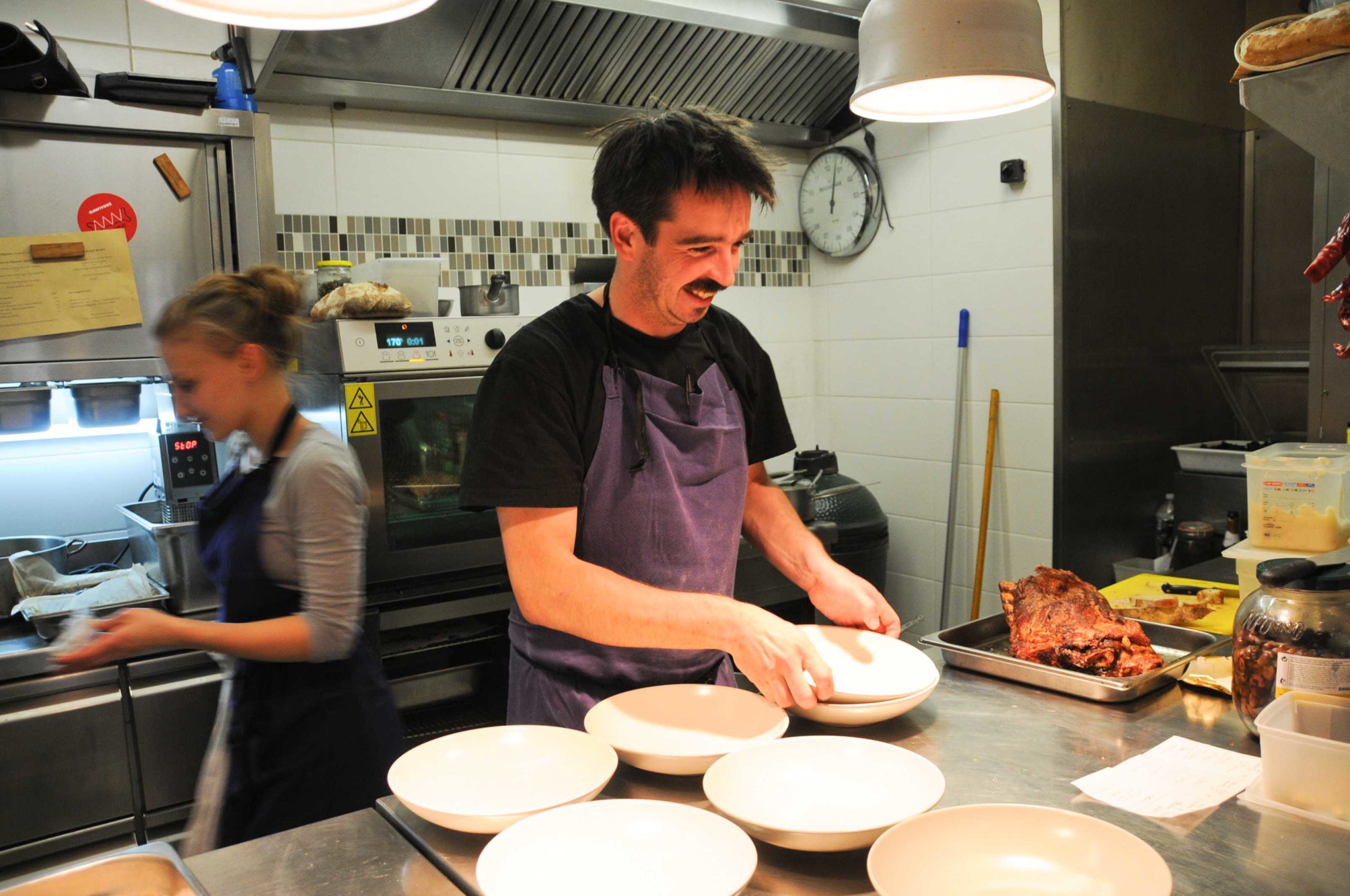 Le cadre est simple, ambiance bistro agréable,  tables en bois et opinel sur la table, on se sent bien, le décor est planté. Depuis la salle du restaurant il est possible de voir travailler le Chef Guillaume Monjuré, élu nouveau Grand de demain par le G&M: